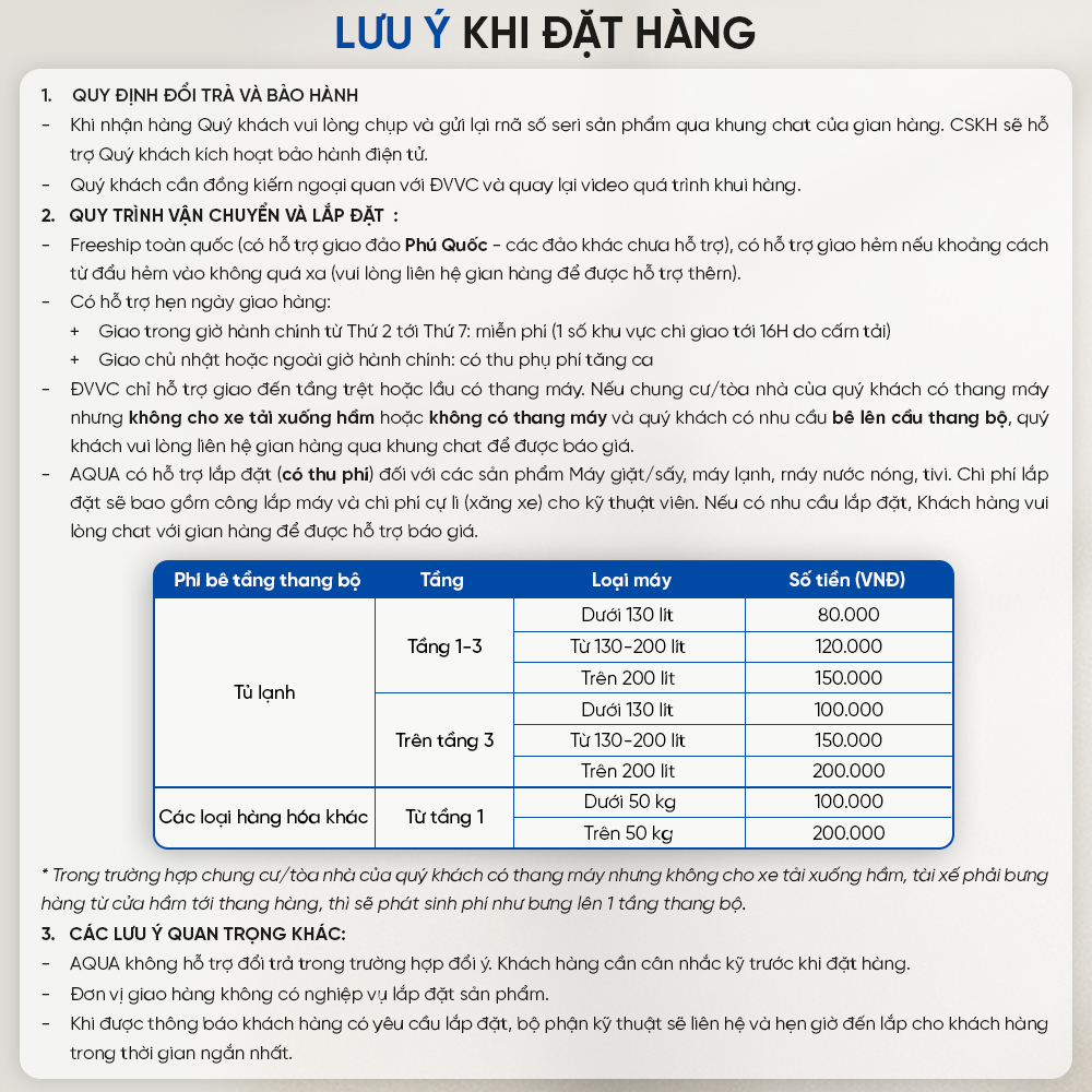 Khu vực ngoại thành HCM có giao hàng tính phí, vui lòng liên hệ trước. - Lắp đặt MIỄN PHÍ ở nhà trệt / có thang máy, lên lầu thang bộ có phí. - Cần