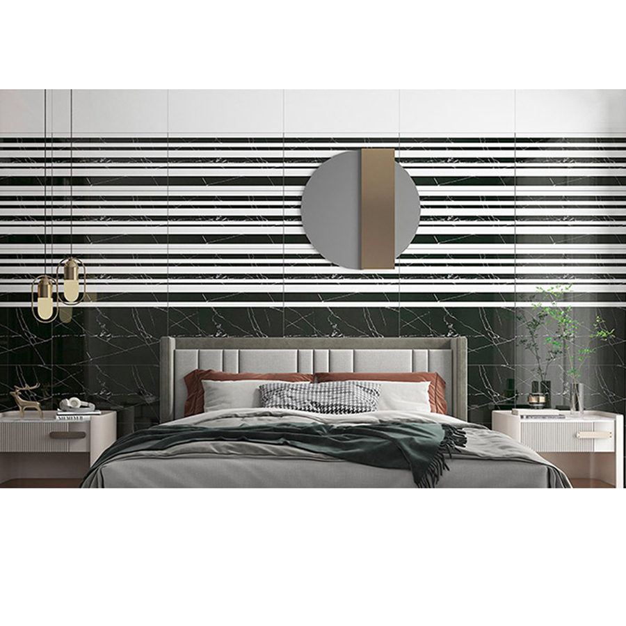 - Thiết kế độc đáo giữa hai màu nền đen trắng chủ đạo giúp gạch dễ dàng phối hợp với nhiều phong cách trang trí nội thất từ cổ điển đến hiện đại.