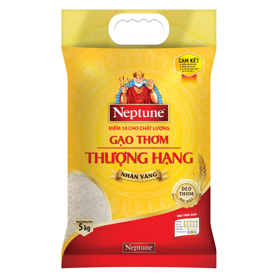 Gạo Thơm Thượng Hạng Neptune Nhãn Vàng 5kgGạo Thơm Thượng Hạng Neptune Nhãn Vàng 5kg được sản xuất từ những giống lúa chất lượng cao vùng Đồng Bằng Sông Cửu Long. Hạt gạo dài, trắng ngà, ít gãy, có m...