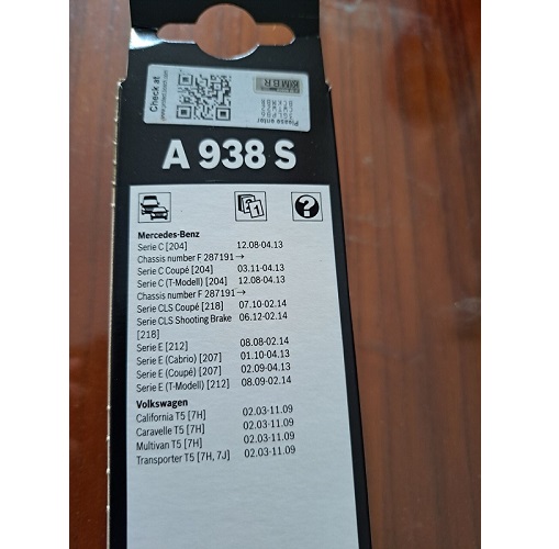 - Kích thước: 24” – 24” (600mm – 600mm) Đặc tính kỹ thuật sản phẩm: • Là bộ 2 chiếc gạt mưa riêng biệt giống như nguyên bản OE theo xe, dành cho các dòng xe Âu và Mỹ. • Cung cấp hiệu quả gạt mưa tối ưu nhất và kéo dài thời gian sử dụng. • Thay thế được 99% các dòng xe lắp gạt nguyên bản. • Khả năng lắp đặt dễ dàng, có hướng dẫn lắp đặt ghi trên vỏ hộp và mã QR code kết nối video. Ứng dụng: MERCEDES-BENZ Serie C động cơ [W204] đời 2008-2013; MERCEDES-BENZ Serie E động cơ [W212] đời 2008-2014.