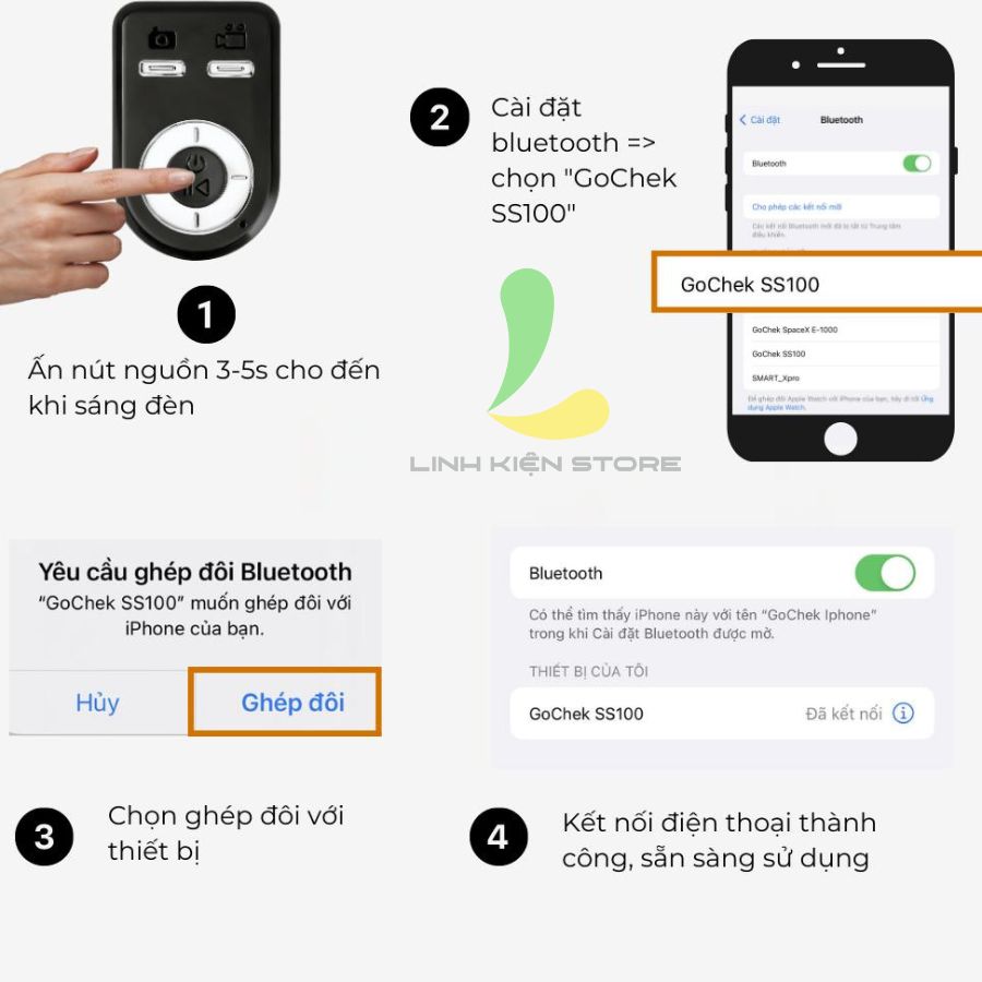 Hướng dẫn sử dụng: - Nhấn và giữ nút chụp trên điều khiển trong khoảng 5 giây cho đến khi đèn màu xanh lam sáng - Mở cài đặt điện thoại -> Bluetooth -> Tìm