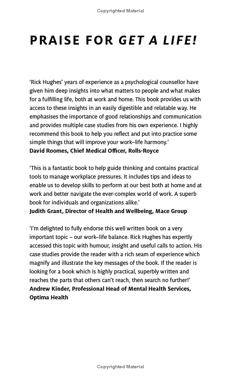 Written by experienced coach, counsellor and wellbeing consultant Rick Hughes, this book covers everything from assessing your own needs, delegation and workload management and the myths of perfectionism, to managing and investing in relationships at work and at home, considering professional and personal development, and creativity and self-worth. With a wealth of advice, case studies and useful action plans founded in over 25 years of real-world experience, Get A Life! will help you find the balance that works for you, now.