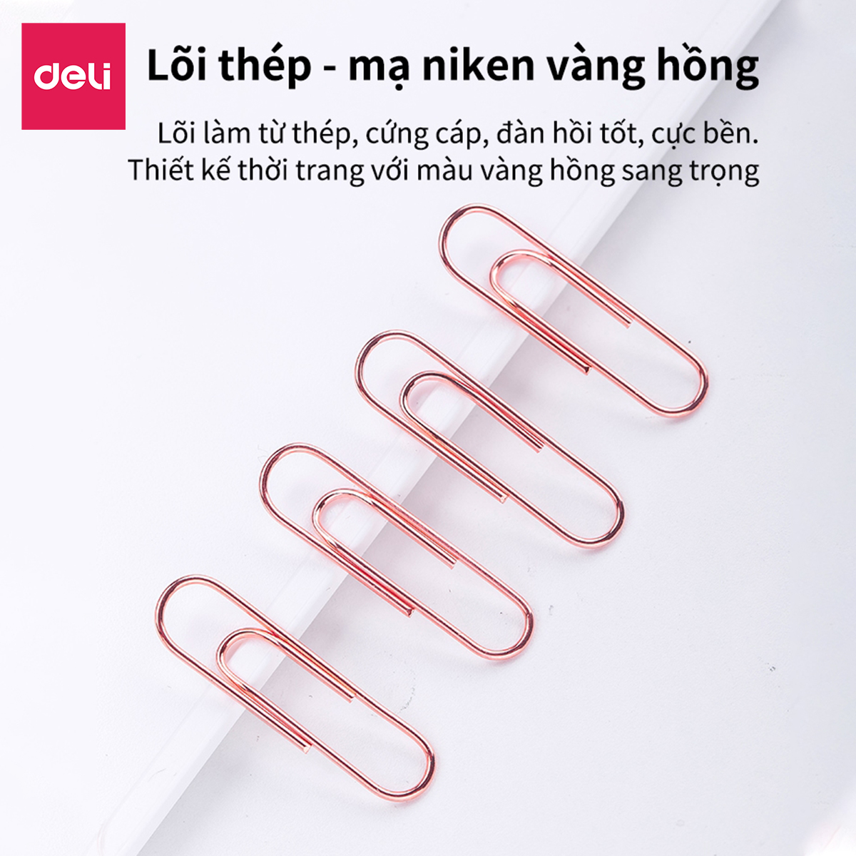 Ghim vòng Deli TÍNH NĂNG SẢN PHẨM: ️ Ghim vòng mạ màu vàng hồng hot trend, đẹp mắt ️ Bề mặt mịn màng đẹp mắt. ️ Có khả năng chống trơn tốt, tiết kiệm sức khi dùng. ️ Không để lại vết xước, có thể sử dụng dài lâu ️ Thiết kế hộp nhựa sang trọng có thể trang trí cho bàn học/ bàn làm việc của bạn