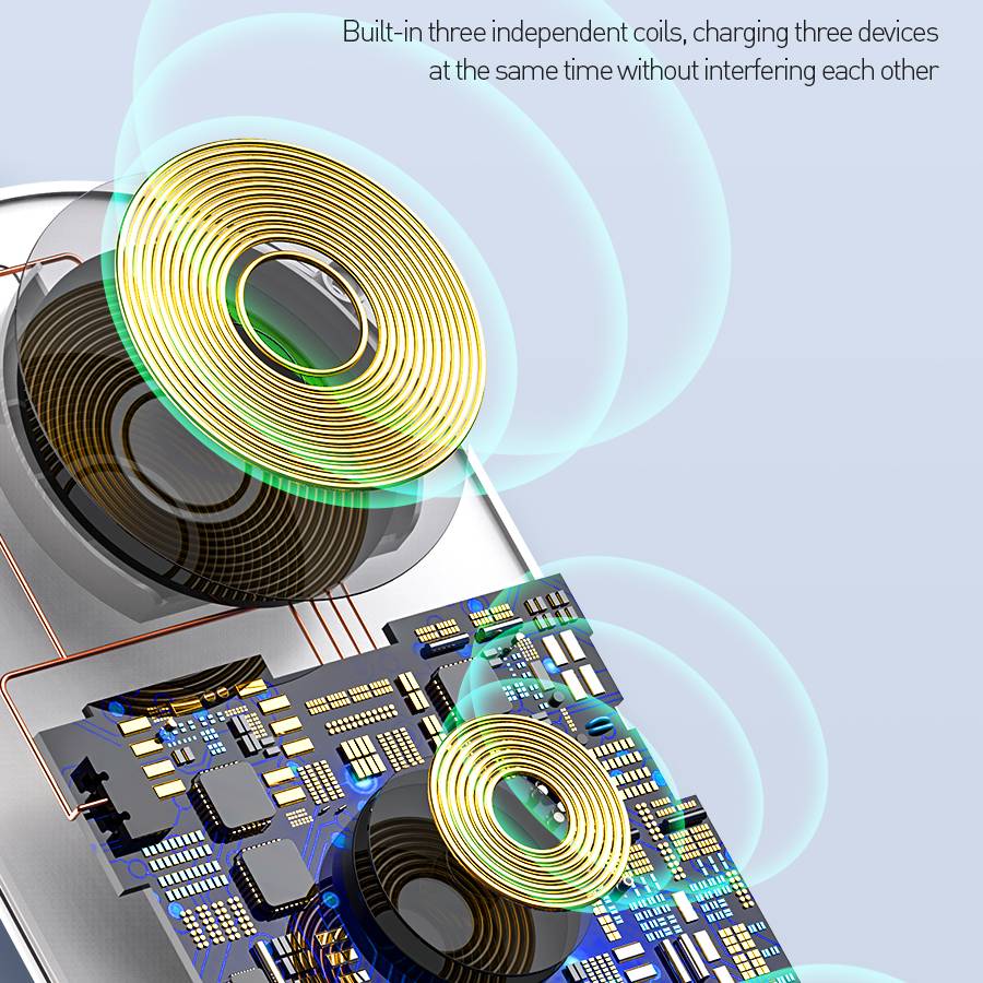 Lực hút nam châm tăng 20% so với các sản phẩm thông thường, giữ chặt thiết bị tương thích ngay cả khi di chuyển. Bạn có thể sạc ba thiết bị cùng lúc với một