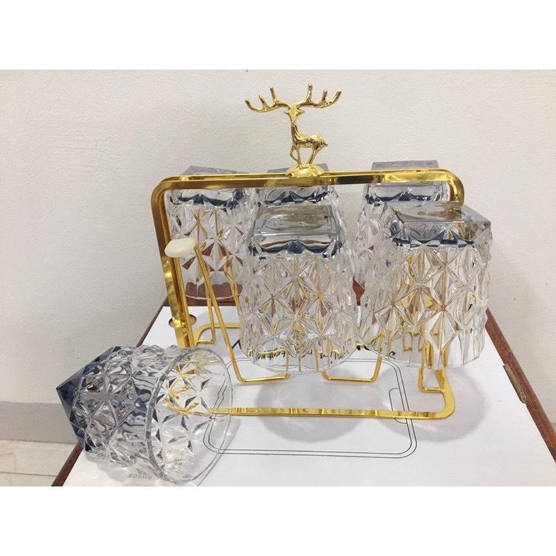 Combo Bộ 6 cốc thủy tinh cao cấp kèm giá úp tròn có khay hứng Combo gồm: 1 bình 6 cốc cốc 1 giá úp hươu 1 khay vương miện