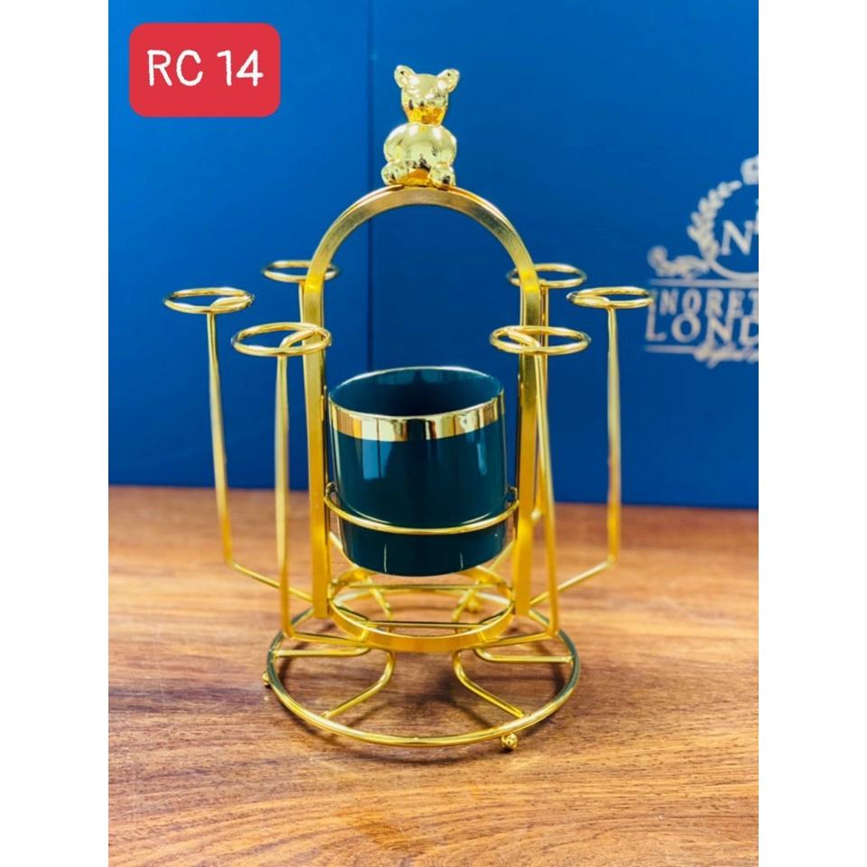 Khay úp cốc 6 chiếc hình gấu mạ vàng, có ống sứ cắm thìa dĩa Giá úp ly, úp cốc mạ vàng kèm ly sứ men xanh đựng dĩa thìa Giá úp có 6 cột