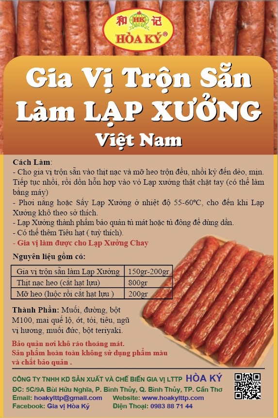 - Gia vị trộn sẵn làm Lạp Xưởng: 150gr- 200gr. -Thịt nạc heo ( cắt hạt lựu ) 800gr -Mỡ heo (luộc rồi cắt hạt lựu )200gr Tiêu ( tuỳ thích) Cách Làm: -Cho gia vị trộn sẵn vào thịt nạc và mỡ heo trộn đều, nhồi kỷ đến dẻo, mịn. Tiếp tục nhồi, rồi dồn hỗn hợp vào vỏ Lạp xưởng thật chặt tay ( có thể làm bằng máy ). -Phơi nắng hoặc Sấy Lạp Xưởng ở nhiệt độ 55-60*c ,cho đến khi Lạp Xưởng khô theo sở thích. -Lạp Xửơng thành phẩm bảo quản tủ mát hoặc tủ đông để dùng dần. Gia Vị làm được cho Lạp Xưởng Chay . Bảo quản nơi khô ráo thoáng mát. Sản phẩm hoàn toàn không sử dụng phẩm màu và chất bảo quản .