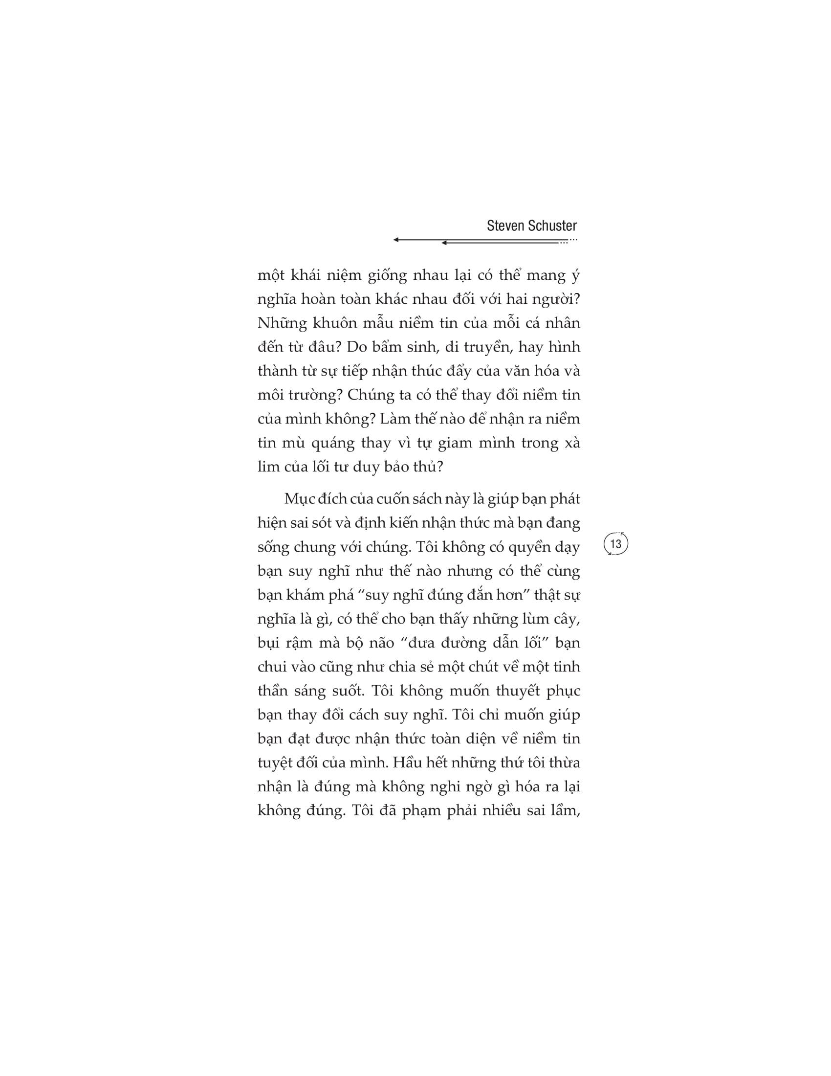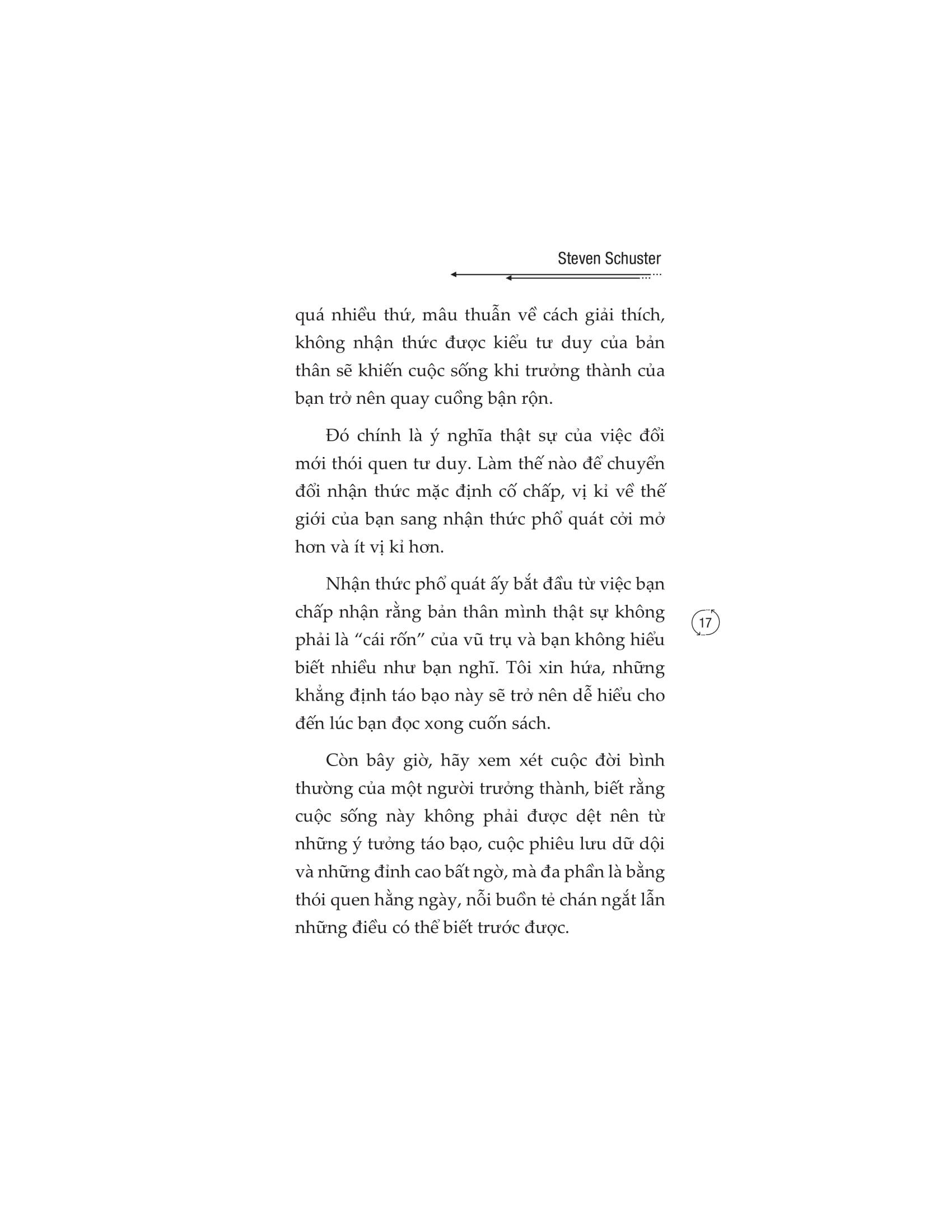 Có một nghịch lý rất quen thuộc là chúng ta thường xuyên được khuyên rằng hãy suy nghĩ kỹ càng trước khi hành động. Nhưng càng cố đào sâu suy nghĩ, càng cân nhắc cẩn thận, chúng ta càng dễ lún sâu vào những cái bẫy của tâm trí. Những cái bẫy đó là cảm xúc lo lắng, bồn chồn, là các luồng suy nghĩ lộn xộn, tiêu cực, mang hơi hướng tự hủy hoại bản thân. Chúng ta bế tắc và không thể thoát ra khỏi các lối mòn, để cuối cùng lại đưa ra những quyết định và hành động cực kỳ thiếu sáng suốt. “Giải phóng bộ não khỏi tư duy độc hại” tập trung vào việc khai thác nguồn gốc gây ra nỗi sợ để chấp nhận và khắc phục chúng, giúp chúng ta kiểm soát các suy nghĩ tiêu cực, cải thiện các mối quan hệ xã hội. Từ đó, giúp người đọc trả lời hai câu hỏi: Vì sao tâm trí bạn thường tự suy diễn ra những ý nghĩ tiêu cực? Làm thế nào để chống lại những suy nghĩ tự hủy hoại bản thân đang làm hại bạn mỗi ngày? Cuốn sách không phải một chỉ dẫn với những lý thuyết khô khan mà sử dụng chính những tình huống đời thường, để hướng dẫn bạn cách cải thiện các mối quan hệ cá nhân, giải phóng tâm trí khỏi nỗi sợ hãi và cho thấy một cách tiếp cận cuộc sống khác. Hãy cùng khám phá cuốn sách, học cách loại bỏ những điều tiêu cực mang tính hủy hoại bản thân và bắt đầu thay đổi tư duy của bạn ngay bây giờ! Tác giả: Steven Schuster trước hết là một người chồng, người cha hạnh phúc của hai đứa con kháu khỉnh. Sinh ra trong một gia đình nhập cư, anh hiểu rõ nhất cuộc đấu tranh của con người và đã dành cả cuộc đời mình để tìm ra giải pháp cho chúng. Anh ấy là một nhà nghiên cứu tâm lý con người nhiệt huyết. Anh đã chọn viết lách là sự nghiệp chính của mình và có nhiều cuốn sách thuộc top bán chạy trên Amazon. Một số trích dẫn “Bạn không thể thay đổi dòng chảy tự nhiên của cuộc số nhưng có thể thay đổi cách bạn lí giải chúng.” “Bản chất con người vốn hay suy nghĩ. Chính khả năng suy nghĩ đó khiến chúng ta khác biệt với các giống loài khác. Chúng ta nhận thức được việc mình suy nghĩ. Thói quen nhận thức ngày càng phát triển hơn khi chúng ta lớn lên. Chúng ta học hỏi từ cha mẹ. Sau đó đi học, lên đại học, tìm được công ăn việc làm, đọc thật nhiều sách, xem cả tá phim ảnh và kết nối với mọi người. Mỗi một hoạt động này đều vô tình ảnh hưởng đến cách suy nghĩ của chúng ta. Kinh nghiệm nhận thức định hình thế giới quan của mỗi người. Mọi thứ mà cá nhân chúng ta trải nghiệm sẽ đi qua bộ lọc của bản thân và được hợp thức hóa. Rất thực tế. Còn thực tế hơn cả những thứ chúng ta chưa từng trải qua. Cho dù những điều chúng ta tin có thể không phải lúc nào cũng đúng.” “Đừng cho rằng những giá trị mà mọi người cho là tiêu cực đều đúng vì chúng ta đều hiểu rằng “sai” hay “đúng” chỉ mang tính chủ quan. Dựa trên kinh nghiệm và giá trị khác nhau, người ta sẽ có câu trả lời khác nhau cho cùng một câu hỏi và không có đáp án nào trong số đó tốt hơn hay tệ hơn cái nào.” “Thay vì tập trung vào những phản hồi vô ích không bao giờ chấm dứt, tốt hơn hết bạn hãy chú tâm vào nguồn gốc gây ra nỗi lo sợ, chấp nhận và khắc phục chúng.” “Tất cả mọi việc bạn thích (hoặc có thể chịu đựng) cùng với một chút kiến thức nền tảng và làm việc chăm chỉ có thể đưa bạn lên đến đỉnh vinh quang. Đam mê đến từ sự tích lũy kiến thức, tự tin và thành công mà bạn góp nhặt bằng việc lao động cần mẫn trong công việc hiện tại. Bạn càng giỏi trong công việc mình làm, bạn càng say mê nó.”