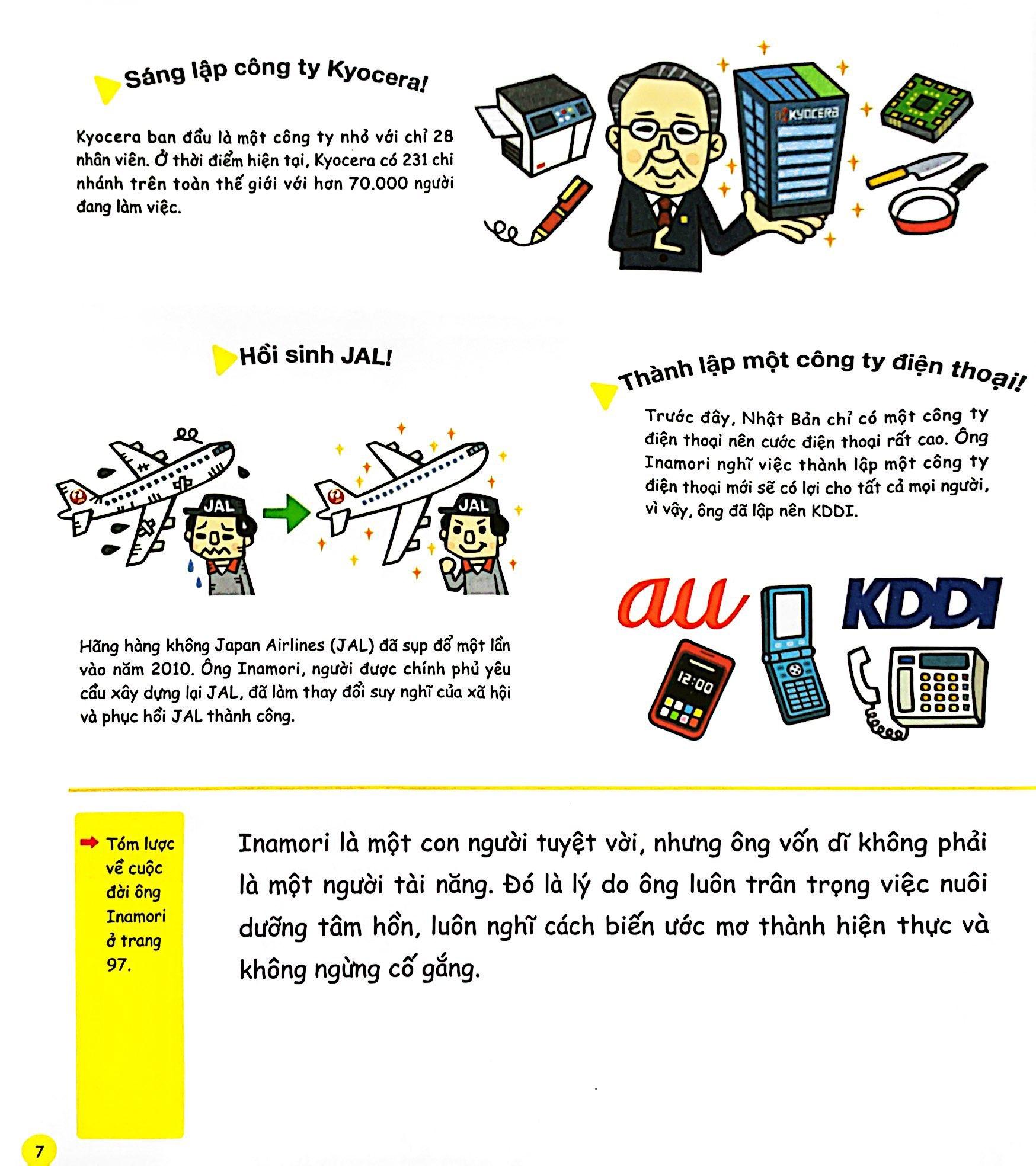 Ông Inamori chính là người đã thành lập Kyocera, một công ty lớn chuyên sản xuất các bộ phận cho tivi, điện thoại di động và những thứ hữu ích khác cho cuộc sống con người. Không chỉ Kyocera mà cả hai công ty từng bị phá sản: Công ty sản xuất điện thoại KDDI và Công ty cổ phần hàng không Nhật Bản (Japan Airlines) đều là những thành quả đáng kinh ngạc của ông.