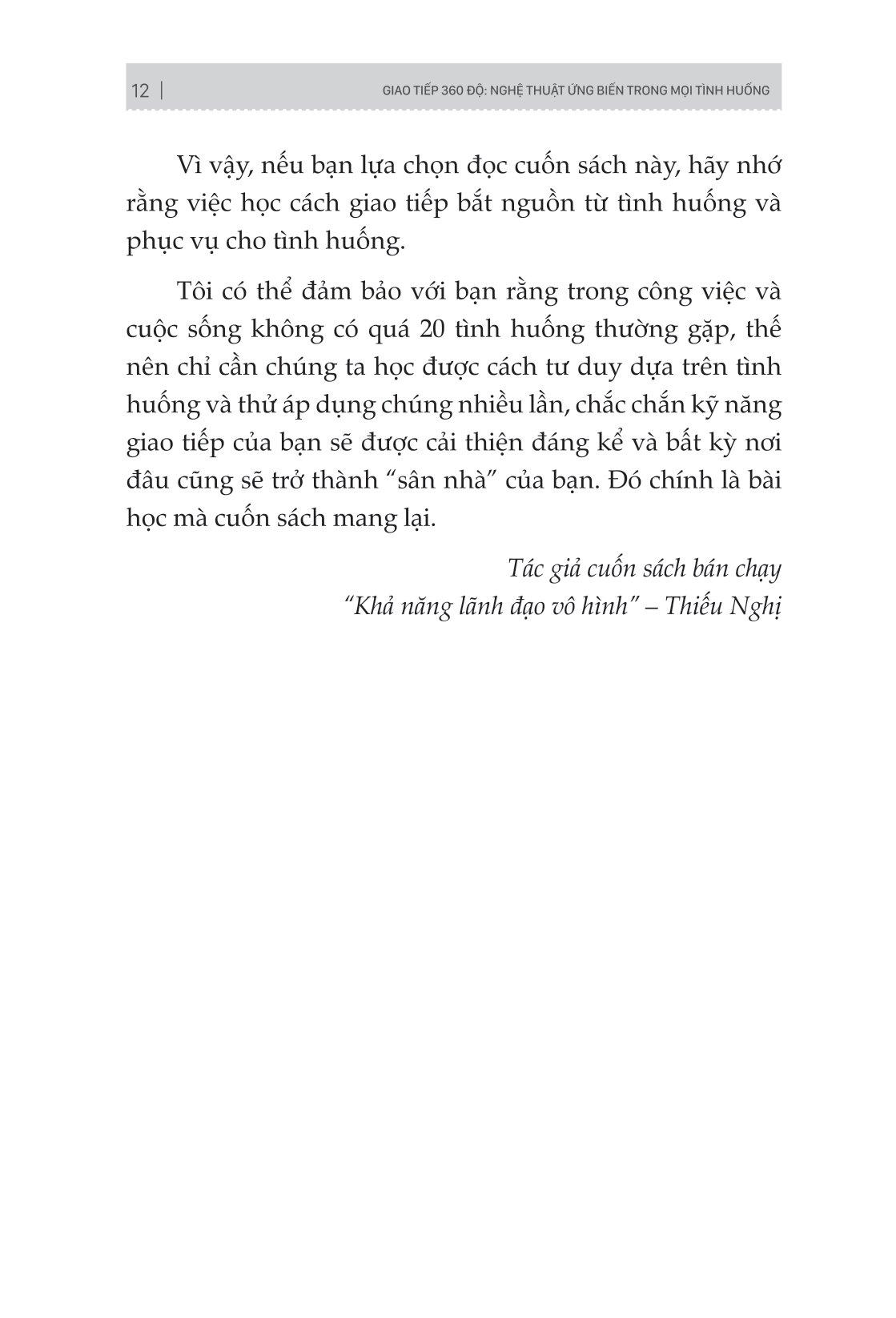 Câu trả lời là hoàn toàn có thể và lời giải đáp sẽ được nằm trong cuốn sách Giao Tiếp 360 Độ: Nghệ thuật ứng biến trong mọi tình huống. Nếu bạn luôn gặp khúc mắc hay các vấn đề về giao tiếp vậy thì hãy để cuốn sách này mách nước cho bạn từ A - Z cách xử lý hiệu quả các tình huống từ dễ đến khó trong giao tiếp hàng ngày bất kể là ở công việc, cuộc sống hay cả về chuyện tình cảm của bạn. 292 trang sách không quá dài nhưng lại mang đến quá nhiều kiến thức để bạn tạo dựng được nhiều mối quan hệ tốt đẹp, khám phá những thế mạnh bên trong bản thân m.ình và lấy lại quyền chủ động xã giao, rèn luyện khả năng “cải thiện nghịch cảnh” giao tiếp trong bất kỳ tình huống nào!
