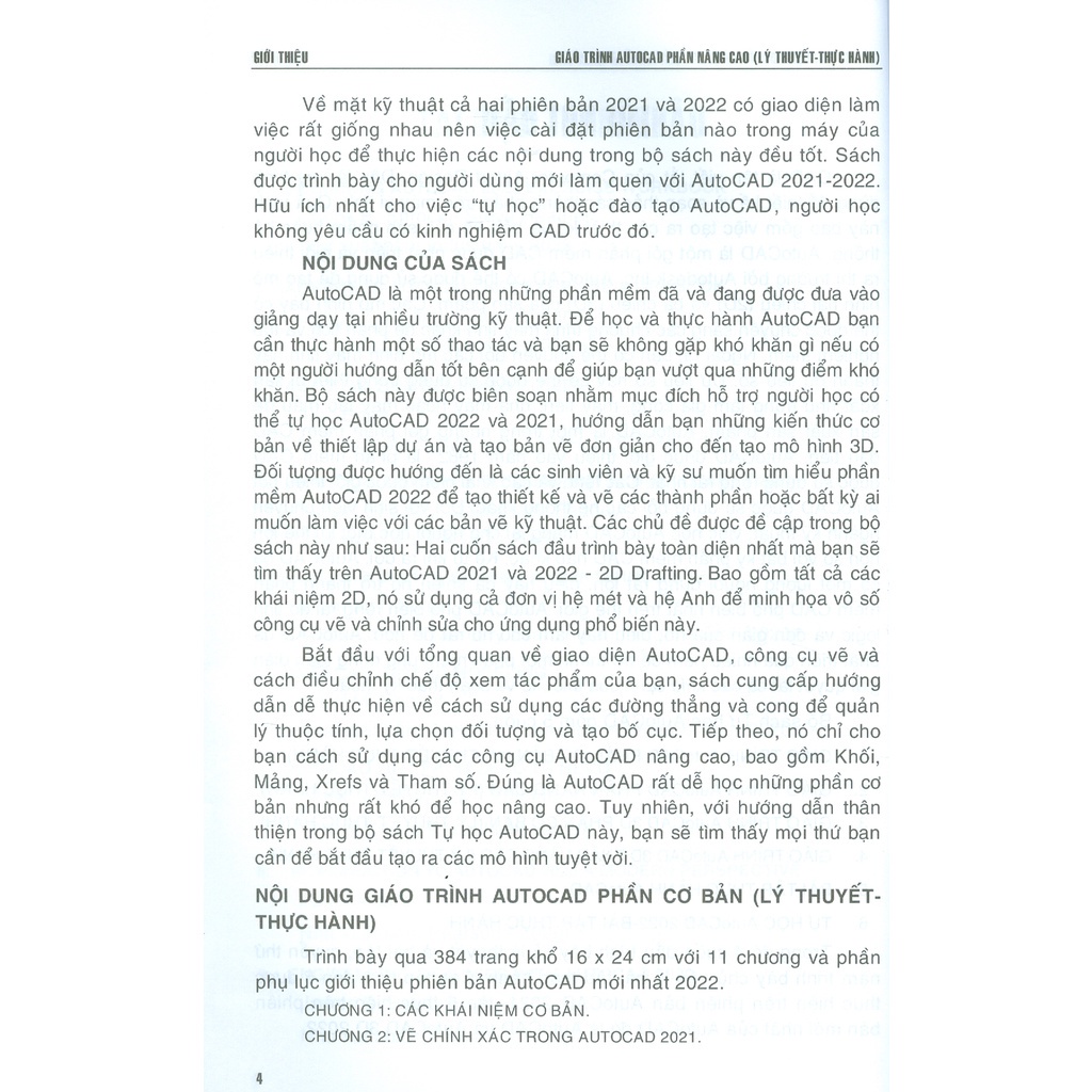 Nội dung Giáo trình AutoCad Phần Nâng Cao với 13 chương và phần phụ lục giới thiệu Bài tập thực hành: Bài tập thực hành nâng cao; Sử dụng công cụ khối và chỉnh sửa khối; Tạo các kiểu văn bản, kiểu bảng và tạo công thức trong bảng; Các kiểu kích thước và Multileder; Plot Styles, Annotatative và Export; Tạo các file mẫu và tùy chỉnh giao diện; Các ràng buộc tham số; Các khối động; Tham chiếu bên ngoài; Các bộ S"