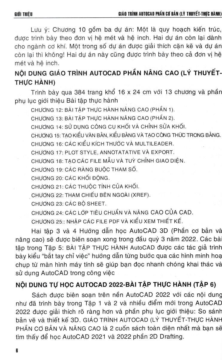 Trong đó 4 cuốn đầu trình bày cả lý thuyết và bài tập, quyển thứ năm trình bày chủ yếu là bài tập thực hành. Các tập từ 1 đến 5 được thực hiện trên phiên bản AutoCAD 2021, tập 6 thực hiện trên phiên bản mới nhất của AutoCAD đó là AutoCAD và AutoCAD 3D 2022.