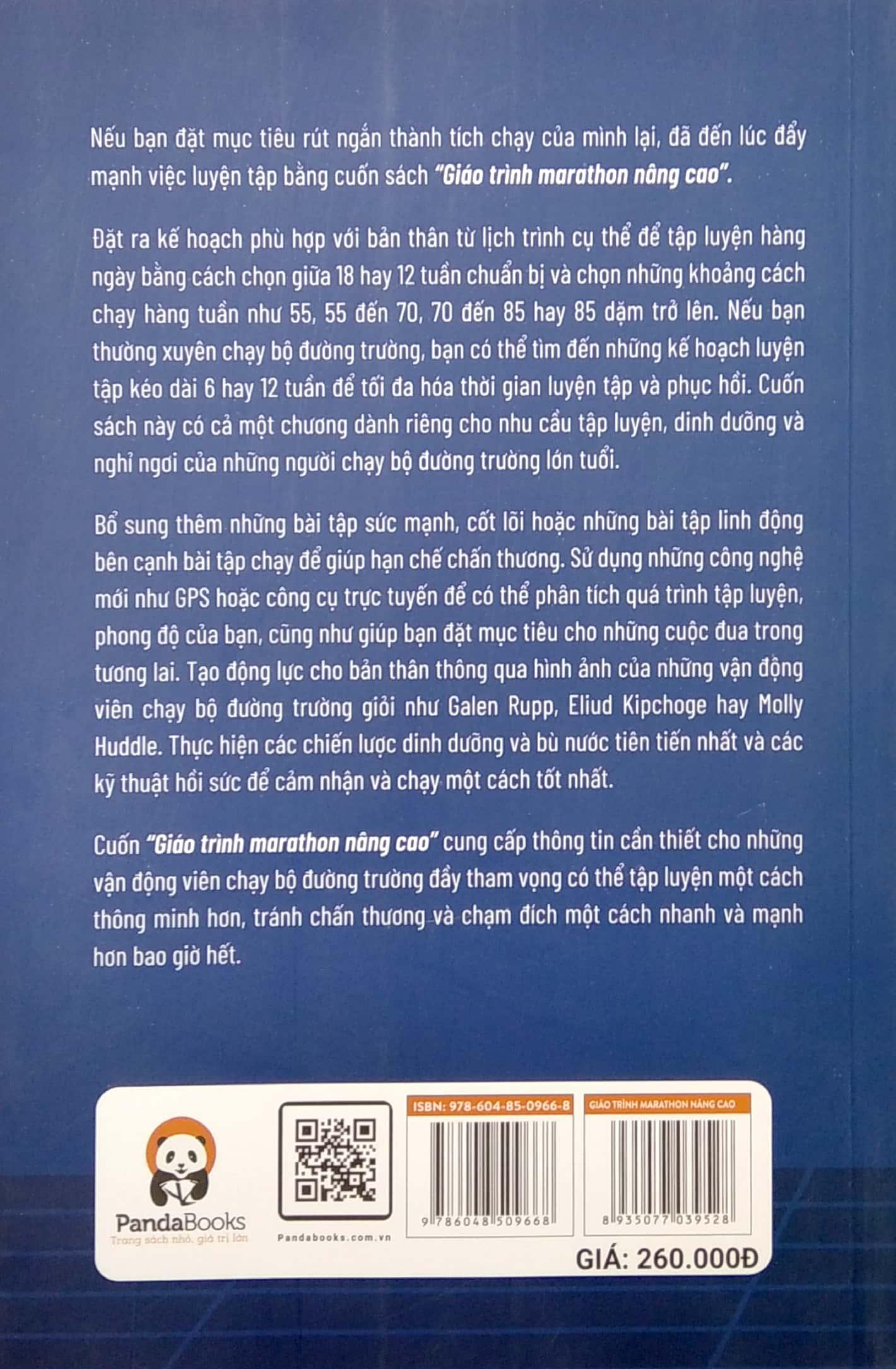 Chìa khóa để dễ dàng hoàn thành cự ly marathon không phải là bí mật: hãy tập luyện thật nhiều để chạy được thật xa. Nhưng sẽ ra sao khi bạn muốn tham gia một cuộc thi chạy marathon? Mọi thứ không còn quá đơn giản như vậy nữa. | Bên cạnh việc đạt được đủ sức bền cơ bản để hoàn thành cự ly, giờ đây bạn còn phải quan tâm đến những vấn đề như: phải chạy dài với tốc độ nhanh chừng nào, nên tập interval' loại nào, vận dụng chế độ ăn thế nào để chạy tốt nhất, sắp xếp lịch tập thế nào để vừa đảm bảo quá trình luyện tập lại vừa hồi phục được, Câu trả lời tốt nhất cho những câu hỏi trên không quá hiển nhiên, và chúng đòi hỏi một nền tảng kiến thức vững chắc. Bạn sẽ có được những kiến thức đó thông qua cuốn sách này.