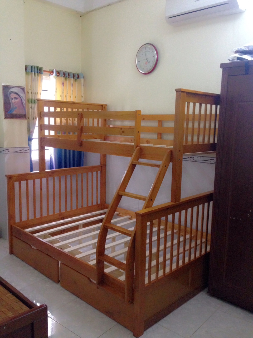 + Chất liệu: Khung giường gỗ thông Newzealand, phân tầng, Vách, đáy hộc gỗ công nghiệp, thang giường MDF chịu lực + Kích thước: kích thước phủ bì, tầng trên ưới 1mx2m Giường tầng hộp