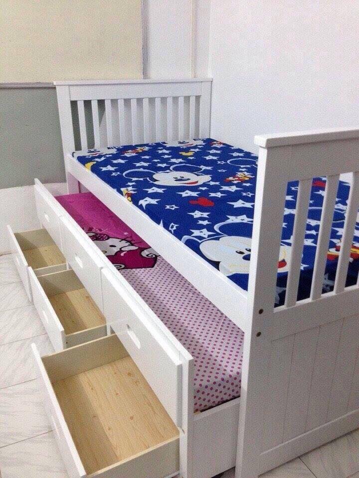 Giường tầng thấp XK Lincoln 1m/1m có kích thước lọt lòng giường trên/dưới là 100x193 cm, phủ bì 208x108x90 cm, chân trụ dày 30x60 mm chịu lực tốt. Ngoài ra, giường còn tích hợp 3 ngăn kéo để đồ tiện lợi, tiết kiệm không gian. Thang giường được làm từ gỗ Plywood chắc chắn, dẻo dai với 13 thanh (cung sinh) bắt vít. Chất liệu gỗ thông xẻ sấy nhập khẩu được gia công tỉ mỉ, kết cấu chắc chắn, giúp các bé vui chơi an toàn và có những giấc ngủ ngon. Giường có 2 loại kích thước là 1m/1m và 1m2/1m2. Tùy nhu cầu, Quý khách có thể chọn loại chỉ giường để gầm thông thoáng, thêm ngăn kéo để đồ hay thêm giường kéo tăng chỗ ngủ. Kích thước DxRxC cả 2 hộc kéo là 95x11x40 cm, giường kéo là 100x185 cm. Miễn phí lắp đặt tại TP.HCM, Bình Dương, Đồng Nai.