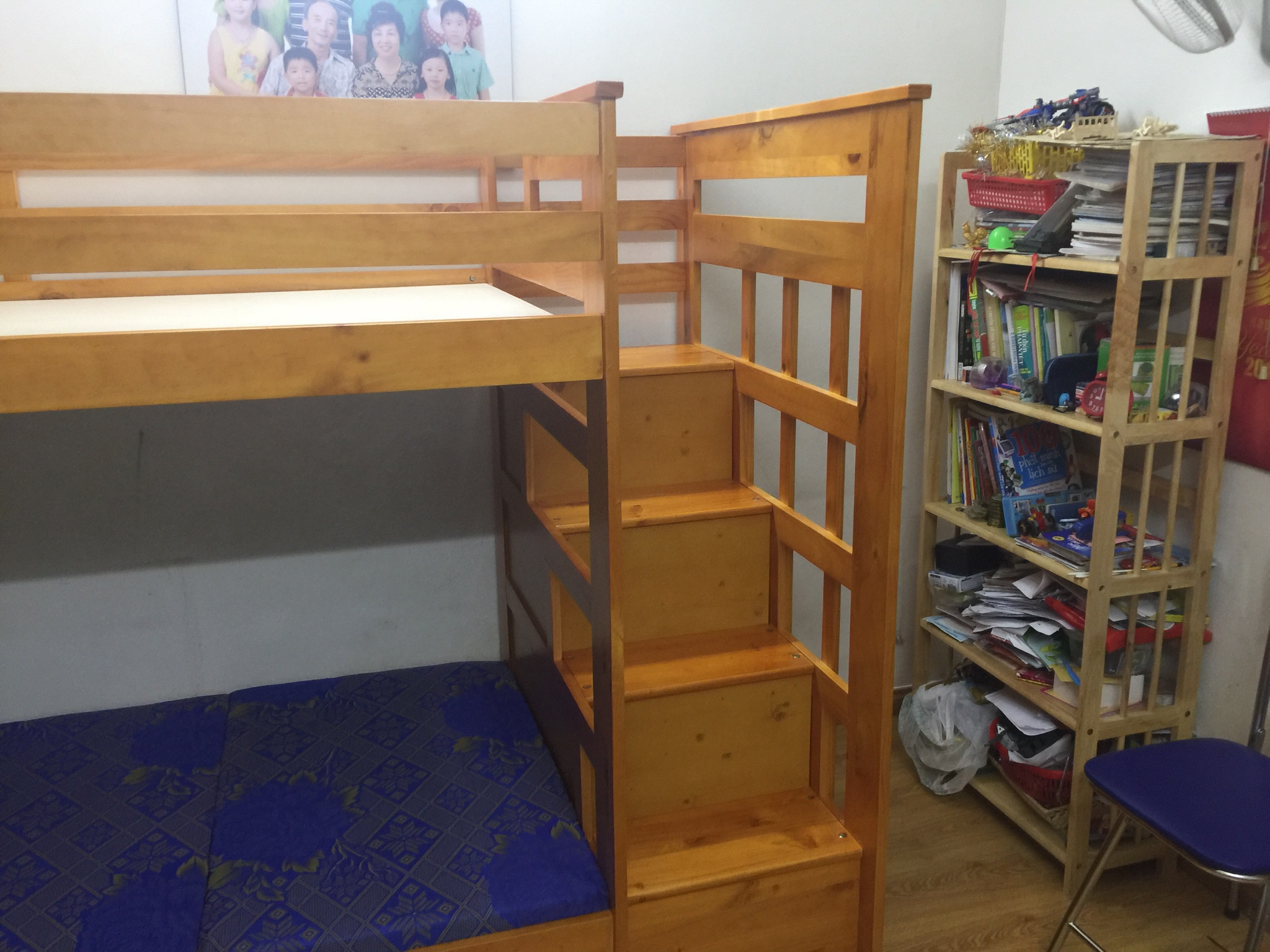 + Chất liệu: Khung giường gỗ thông Newzealand, phân tầng, Vách, đáy hộc gỗ công nghiệp, thang giường MDF chịu lực + Kích thước: kích thước phủ bì, tầng trên ưới 1mx2m Giường tầng hộp