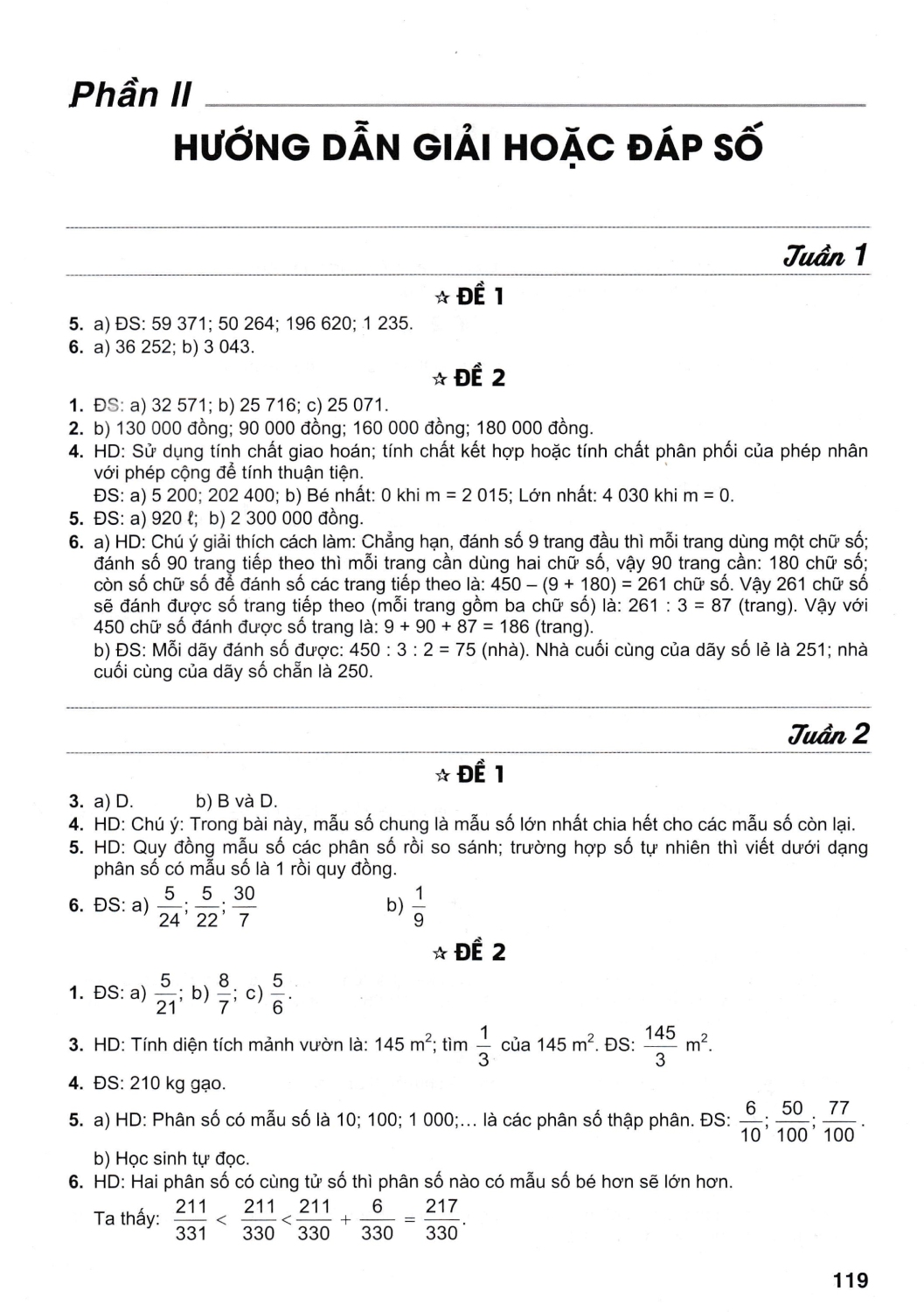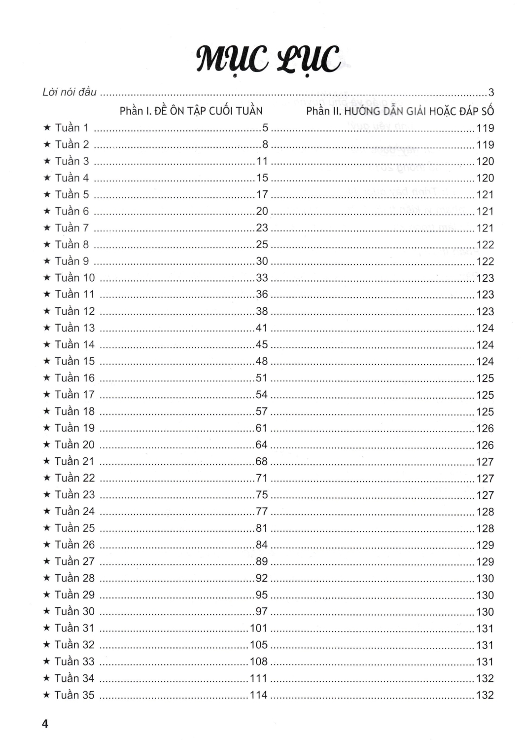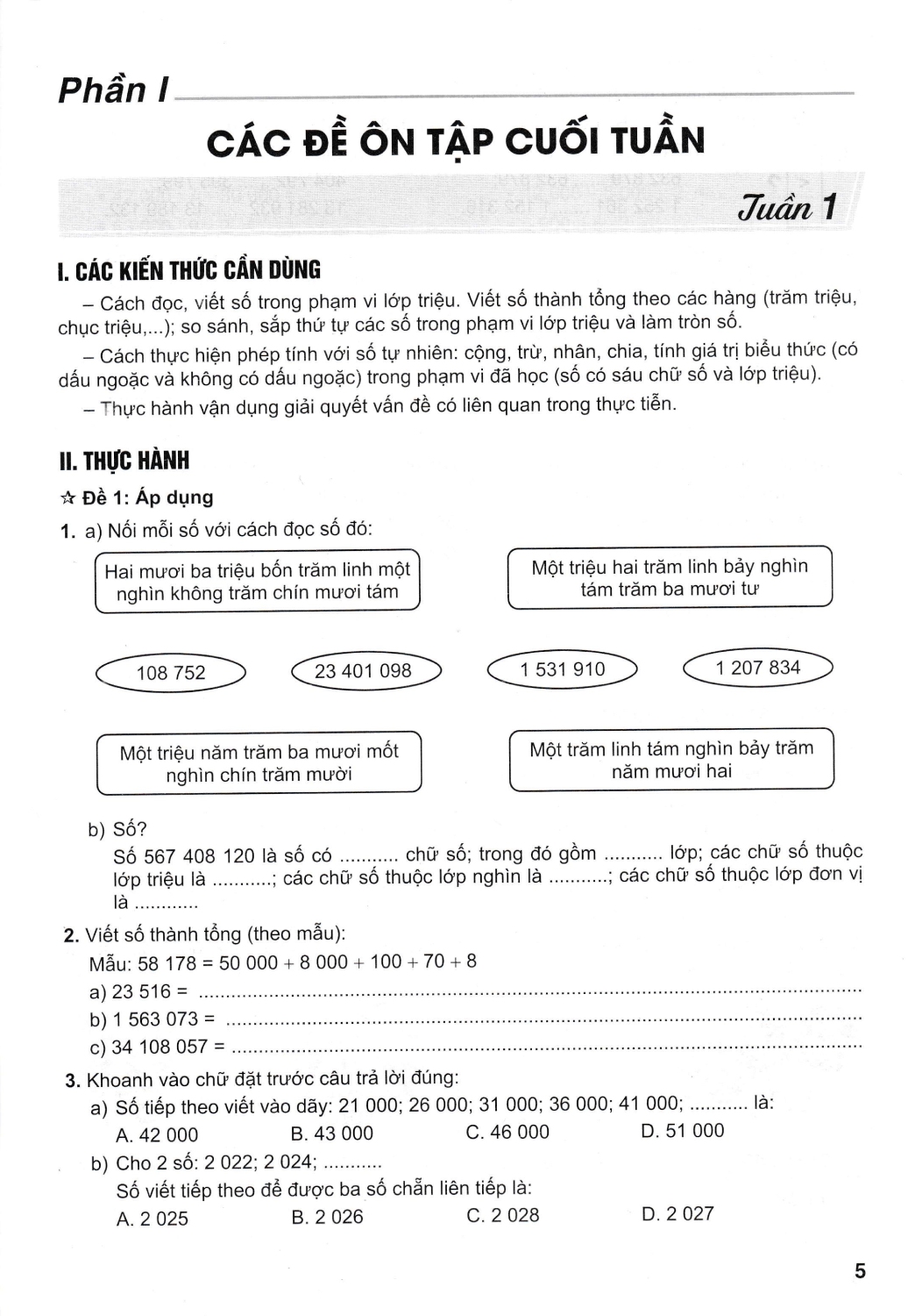 Phần 1: Trình bày dưới dạng các để ôn tập cuối tuần và trải nghiệm giải quyết vấn đề trong phạm vi kiến thức đã học; trong 35 tuần học có 70 để (cuối mỗi tuần có 2 đề); mỗi để cần làm trong khoảng 35 phút đến 40 phút.