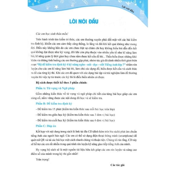 Mua tại Tiktok“Bộ đề kiểm tra định kỳ 4 kỹ năng nghe - nói - đọc - viết Tiếng Anh lớp 7” nhằm rèn luyện cho các em kĩ năng làm bài thi, làm chủ các dạng đề, hiểu được kết cấu và cách thức ra đề của từng kỳ thi. Khi các em đã quen với các dạng bài tập và trải nghiệm làm đề thường xuyên thì việc tự tin trước các kỳ thi là điều hiển nhiên có được.