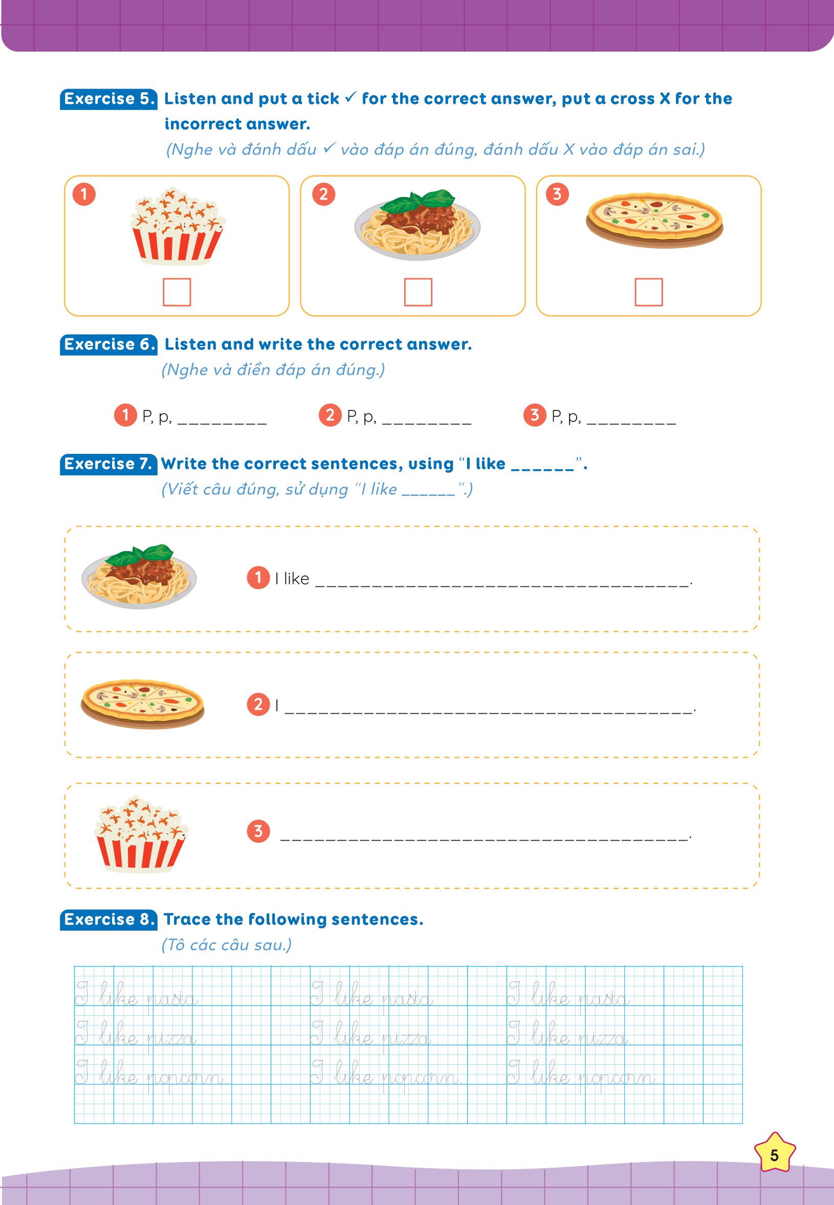 3. File nghe phát âm chuẩn (quét mã QR)   Mỗi bài tập đi kèm với mã QR cho phép truy cập vào file nghe phát âm chuẩn của từ vựng. Điều này giúp các em học sinh luyện nghe và học phát âm chính xác ngay từ đầu, xây dựng nền tảng ngôn ngữ vững chắc.