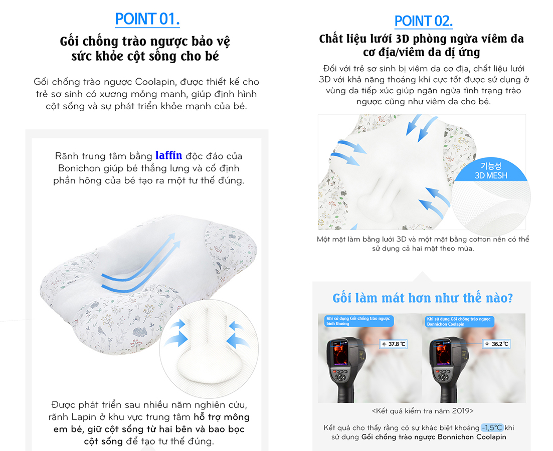 Gối chống trào ngược Bonnichon Coolapin giải quyết ba vấn đề cùng một lúc, chẳng hạn như trào ngược dạ dày, bé sốt khi sinh và bảo vệ cột sống cho bé