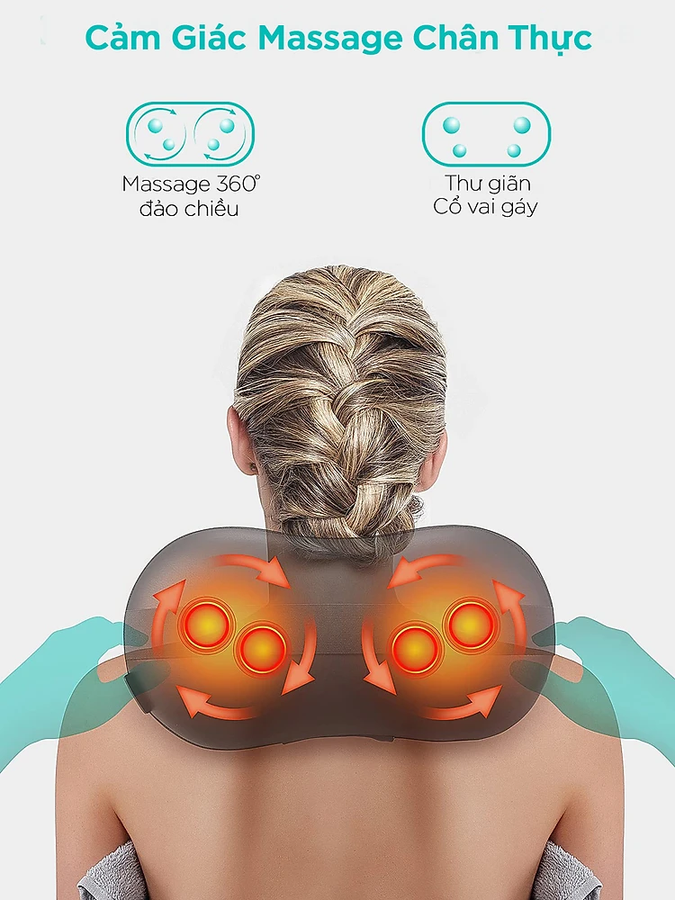Máy massage cổ có 4 đầu massage tự động đảo chiều, phù hợp cho nhiều vị trí trên cơ thể. Thiết kế với cơ chế linh hoạt giúp ôm sát với các đường cong trên