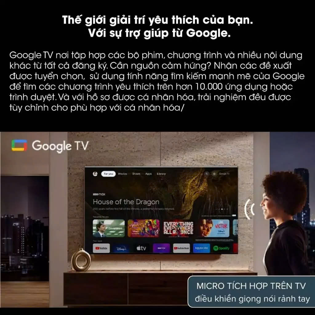 - Hệ điều hành Google TV cung cấp giao diện người dùng thân thiện với các mục thông tin được sắp xếp gọn gàng, thao tác và sử dụng dễ dàng.