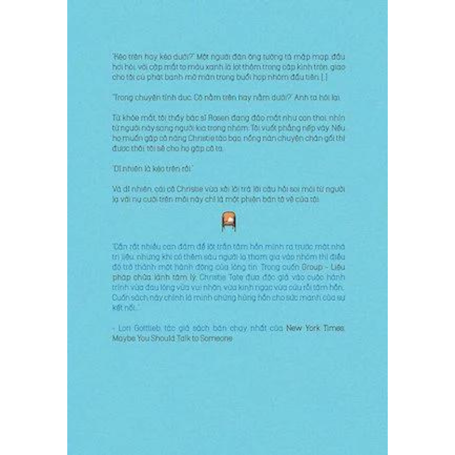 “Cần rất nhiều can đảm để lột trần tâm hồn mình ra trước mặt nhà trị liệu, nhưng khi có thêm sáu người lạ tham gia vào nhóm thì điều đó trở thành một hành động của lòng tin. Trong cuốn Group – Liệu pháp chữa lành tâm lý, Christie Tate đưa độc giả vào cuộc hành trình vừa đau lòng vừa vui nhộn, vừa kinh ngạc vừa cứu rỗi tâm hồ Cuốn sách này là minh chứng hùng hồn cho sức mạnh của sự kết nố” - Lori Gottlieb, tác giả sách bán chạy nhất Maybe You Should Talk to Someone