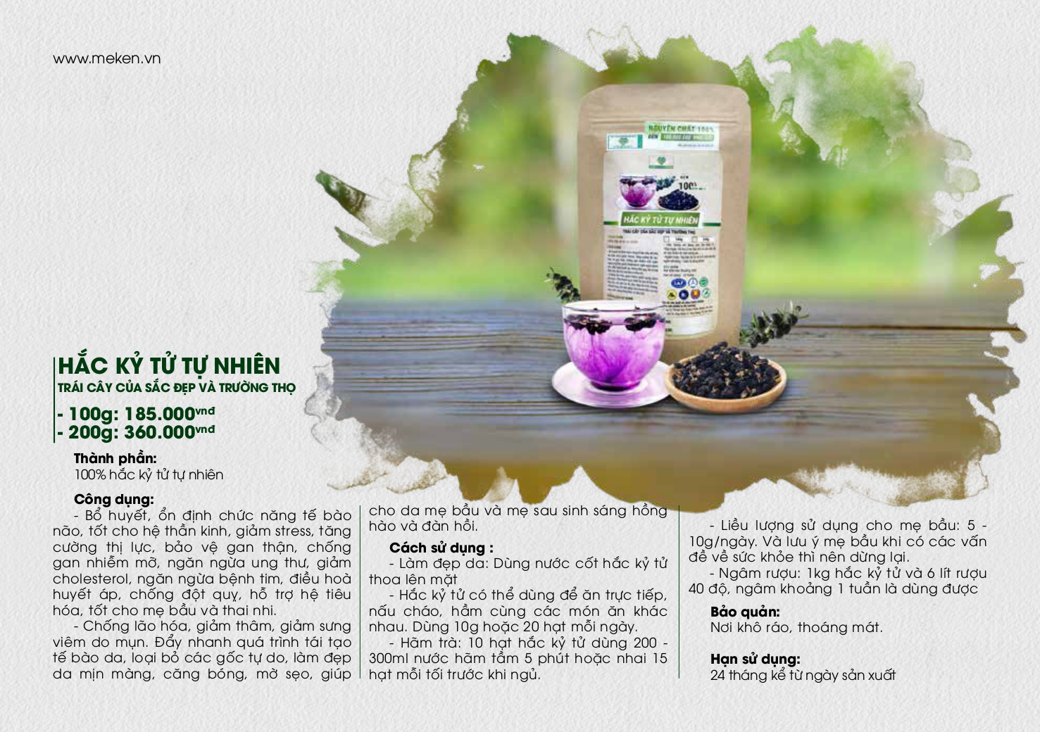 * Thành phần : 100% Hắc kỷ tử tự nhiên . * Công dụng : Bổ huyết, ổn định chức năng tế bào não, tốt cho hệ thần kinh, giảm stress, tăng cường thị lực, bảo