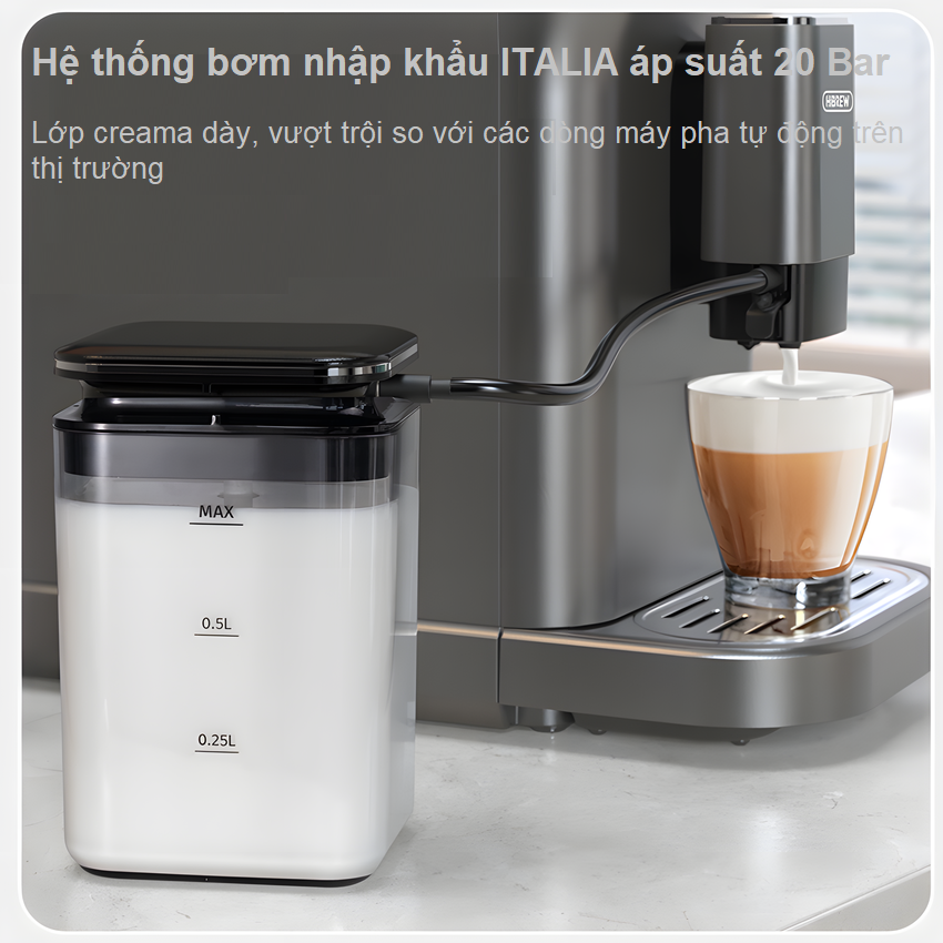 - Hệ thống tạo bọt sữa tự động của máy tạo ra sữa có kết cấu hoàn hảo cho cà phê sữa và cà phê cappuccino, giúp bạn không phải phỏng đoán để đạt được bọt kem và mịn như nhung. Máy đánh sữa tích hợp của HiBREW H16 mang lại kết quả nhất quán, tiết kiệm thời gian và công sức cho người dùng văn phòng muốn thưởng thức đồ uống cà phê đặc biệt mà không gặp rắc rối. Đặc điểm nổi bật