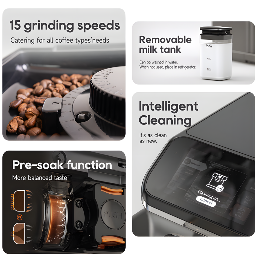 - Chỉ cần chạm và click, mọi thông số: khối lượng, độ mịn cà phê sẽ được lưu lại dành cho lần pha chế tiếp theo luôn hoàn hảo. Tất cả thao tác thực hiện trên màn hình cảm ứng 4.3 inch dễ dàng.