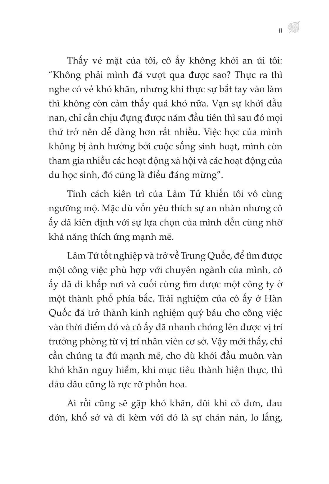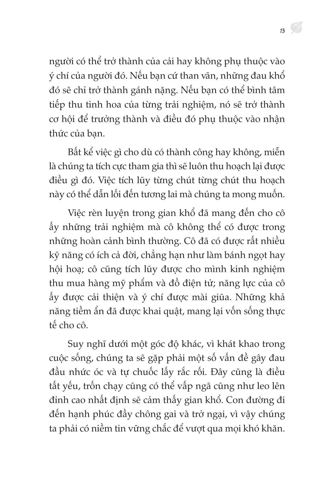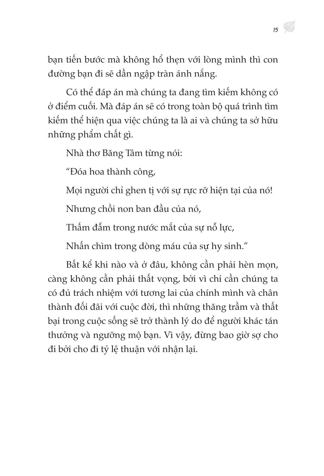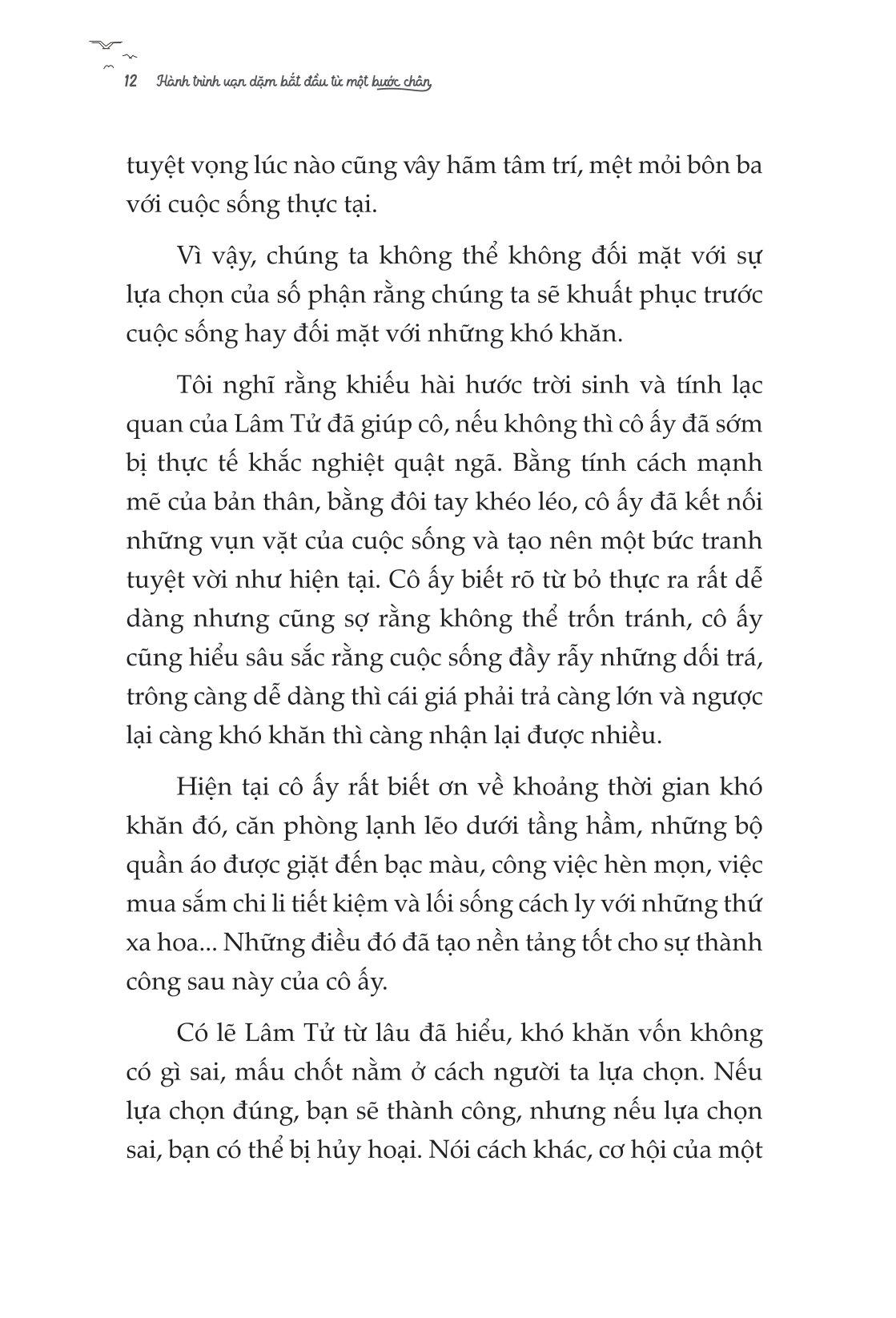 - Gian khổ bạn trải qua sẽ mở đường cho tương lai của bạn Vì sao hành trình vạn dặm bắt đầu từ một bước chân là một cuốn sách không thể bỏ lỡ? Bạn có cần động lực không? CÓ! “Người luôn chùn bước vĩnh viễn không thể trở nên ưu tú hơn, chỉ có trải qua muôn vàn thử thách và chà đạp, ở thời điểm ta đứng lên lần nữa mới có thể càng thêm rực rỡ lấp lánh. Chỉ có người dũng cảm tiến về phía trước mới có thể leo lên đỉnh cao của thế giới để ngắm cuộc sống này.” Đời người có lúc thăng lúc trầm, có lúc vui vẻ, có lúc khổ đau. Nhưng đối mặt với áp lực và khổ đau, con người dễ dàng từ bỏ. “Hành trình vạn dặm bắt đầu từ một bước chân” sẽ là cuốn sách có thể thấu hiểu những nỗi vất vả mà bạn đang trải qua, để bạn hiểu được rằng, khi muốn buông xuôi hãy nhớ, lá trà phải dùng nước nóng mới trở nên thơm ngát, con người phải có gian khó ban đầu mới tiến được đến thành công. Bạn có cần tỉnh ngộ không? CÓ “Mọi sự tầm thường đều là hình ảnh thu nhỏ của việc không đủ nỗ lực. Kẻ thù lớn nhất của chúng ta không phải già nua và đau khổ, mà là một trái tim bằng lòng với thực trạng, được ngày nào hay ngày ấy” Ngày ngày nằm ườn bấm điện thoại, mơ ước về cuộc đời của người khác, có mong muốn nhưng chỉ sợ lúc làm sẽ thất bại nên không dám thử. Nhưng bạn cứ tiếp tục như thế thì tương lai sẽ cười vào mặt bạn. Nếu bạn chưa tỉnh ngộ, vậy cuốn sách sẽ giúp bạn làm điều đó. Những bài học đắt giá và đanh thép sẽ khiến bạn phải đứng dậy ngay lập tức. Bạn có cần giải pháp không? CÓ “Chỉ bằng cách hành động, chúng ta mới có thể xây dựng tòa nhà tham vọng trong trái tim m.ình, không có hành động, hết thảy đều là trăng trong nước, hoa trong gương.” Có hành động mới có thành công. Không chỉ mang đến động lực và khiến bạn tỉnh ngộ, tác giả mang đến những giải pháp thiết thực để bạn làm được những gì m.ình muốn. Chỉ bằng cách hành động, chúng ta mới chạm được đến ước mơ. Những bài học đắt giá trong cuốn sách Hành trình vạn dặm bắt đầu từ một bước chân Ý nghĩa của gian khổ: Người luôn chùn bước vĩnh viễn không thể trở nên ưu tú hơn, chỉ có trải qua muôn vàn thử thách và chà đạp, ở thời điểm ta đứng lên lần nữa mới có thể càng thêm rực rỡ. Chỉ có người dũng cảm tiến về phía trước mới có thể leo lên đỉnh cao của thế giới để ngắm cuộc sống này. Có lúc lên lúc xuống trong đời là chuyện bình thường: Vạn sự có được thì phải có mất, có mất ắt có được, mọi thứ chỉ là tương đối, trân quý sinh mạng, sống cuộc đời đầy giá trị và đẹp đẽ. Ý nghĩa của cuộc sống: Chúng ta không thể sống một cuộc đời mục nát. Ăn để sống, nhưng sống không chỉ để ăn. Trong cuộc đời con người, ý nghĩa cuộc sống rốt cuộc nằm ở đâu? Con người sống vì cái gì? Cuộc sống có thể không có quá nhiều ý nghĩa, nhưng nếu đã sống, chúng ta phải thiết lập một hướng đi trong cuộc sống cho chính m.ình. Nếu không cuộc sống dù tươi đẹp đến đâu cũng như nhai sáp, nhạt nhẽo và không hề có giá trị. Mơ ước là ngọn đèn soi đường chỉ lối: Lý tưởng là ngọn hải đăng của hành trình nhân sinh, là mục tiêu phấn đấu của cuộc đời, chỉ dẫn phương hướng tiến về phía trước của cuộc đời chúng ta, chỉ cần chúng ta kiên định đi theo phương hướng này, tôi tin rằng, chúng ta cuối cùng nhất định sẽ tới bờ bên kia thành công. Lý tưởng thuộc về mỗi chúng ta. Vì vậy, chúng ta hãy lập cho m.ình những mục tiêu, lý tưởng sống cao cả ở tuổi trẻ để cuộc sống thêm ý nghĩa và giá trị. Những trích dẫn hay trong sách giúp bạn vững bước để thay đổi