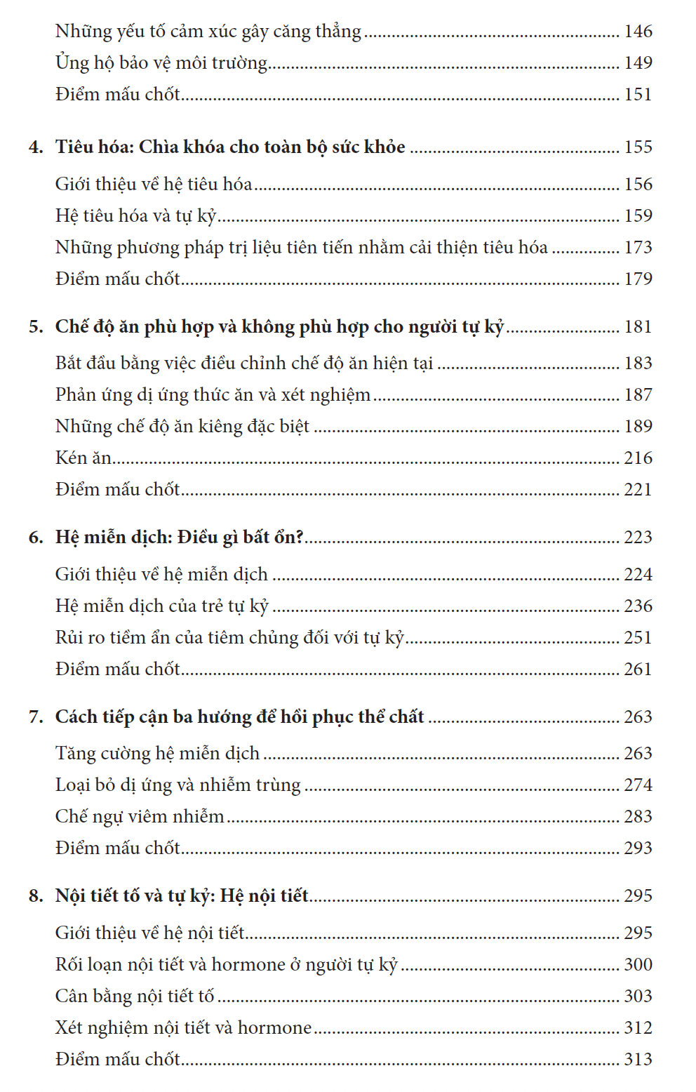Bước 1: Loại bỏ dần yếu tố độc hại, bổ sung yếu tố lành mạnh. Trong bước này, tác giả đề xuất những giải pháp vô cùng thiết thực và khả thi, bao gồm: chuyển đổi lối sống, tập trung nâng cao sức khỏe đường ruột, áp dụng chế độ ăn phù hợp, tăng cường hệ miễn dịch & hệ nội tiết, và thải độc nhằm phục hồi thể chất cho người tự kỷ.