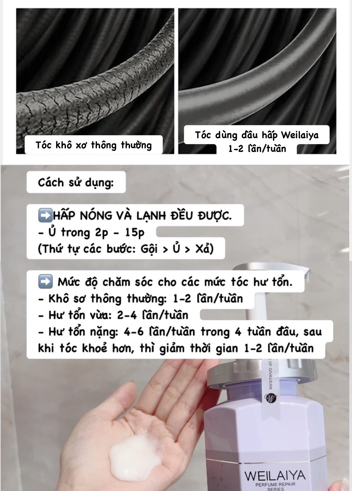 - Mùi hương sang chảnh như nước hoa hàng hiệu, lưu hương 3-4 ngày. Thành phần của Dầu hấp phục hồi liên kết tóc Weilaiya: