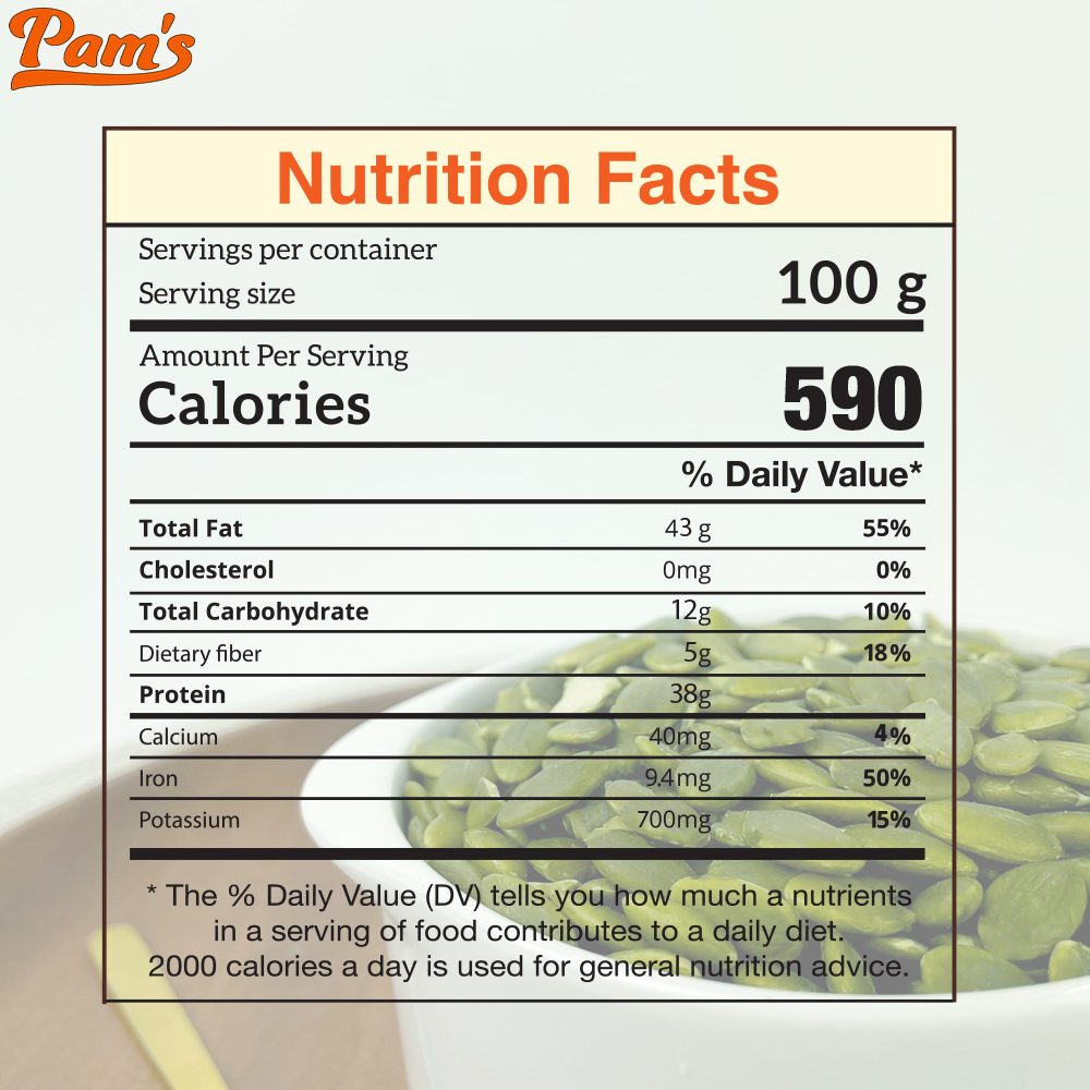 - 20g(1 muỗng canh) Hạt bí xanh rang mộc Pam's cung cấp: 140Calo, 2g Chất xơ, 9g Omega, 2.8g Carbs, 5g Protein, 110mg Canxi, 1000mg Kali, 120mg Mangan, 510mg Photpho