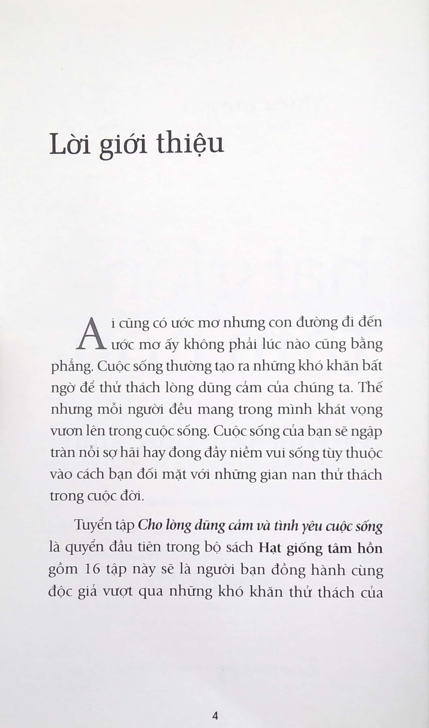 Đó chính là ý tưởng chính của hai tập sách Hạt giống tâm hồn: Cho Lòng Dũng Cảm và Tình Yêu Cuộc Sống do First News (NXB TP. HCM) phát hành. Tập sách gồm 100 bài viết, truyện ngắn hay, có ý nghĩa sâu sắc (mỗi tập 50 truyện), gần gũi với cuộc sống, mang tính tự nhận thức và giáo dục cao.
