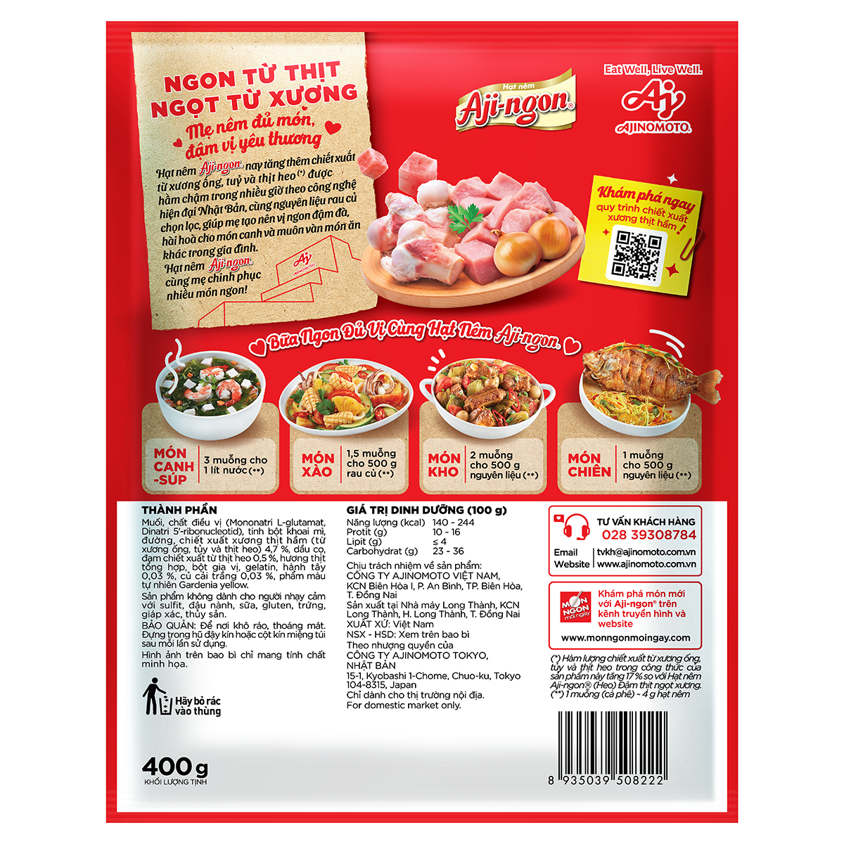 Mua tại TiktokĐược làm từ nước dùng của xương và thịt heo cùng với một lượng cân đối các loại gia vị khác. Hạt nêm vị heo Aji-ngon 400g là đến từ loại hạt nêm mang lại hương vị thơm ngon tự nhiên cho món ăn của gia đình bạn. Hạt nêm Aji-ngon gói nhỏ phù hợp nhu cầu sử dụng gia đình và dễ mang đi. Hạt nêm Xương, thịt heo Aji-ngon gói 400g được làm từ thịt và xương heo nguyên chất theo công nghệ tiên tiến của Nhật Bản. Với công thức "Đậm xương thịt, thêm đậm đà", hạt nêm Aji-ngon giúp cho các món ăn thêm đậm vị, thơm ngon. Ngoài ra, hạt nêm được bổ sung canxi theo dự án hợp tác với Hội Dinh dưỡng Việt Nam. Khi sử dụng 3 muỗng hạt nêm Aji-ngon, bạn đã cung cấp thêm 100mg canxi, giúp cải thiện sức khỏe gia đình. Hướng dẫn sử dụng:
