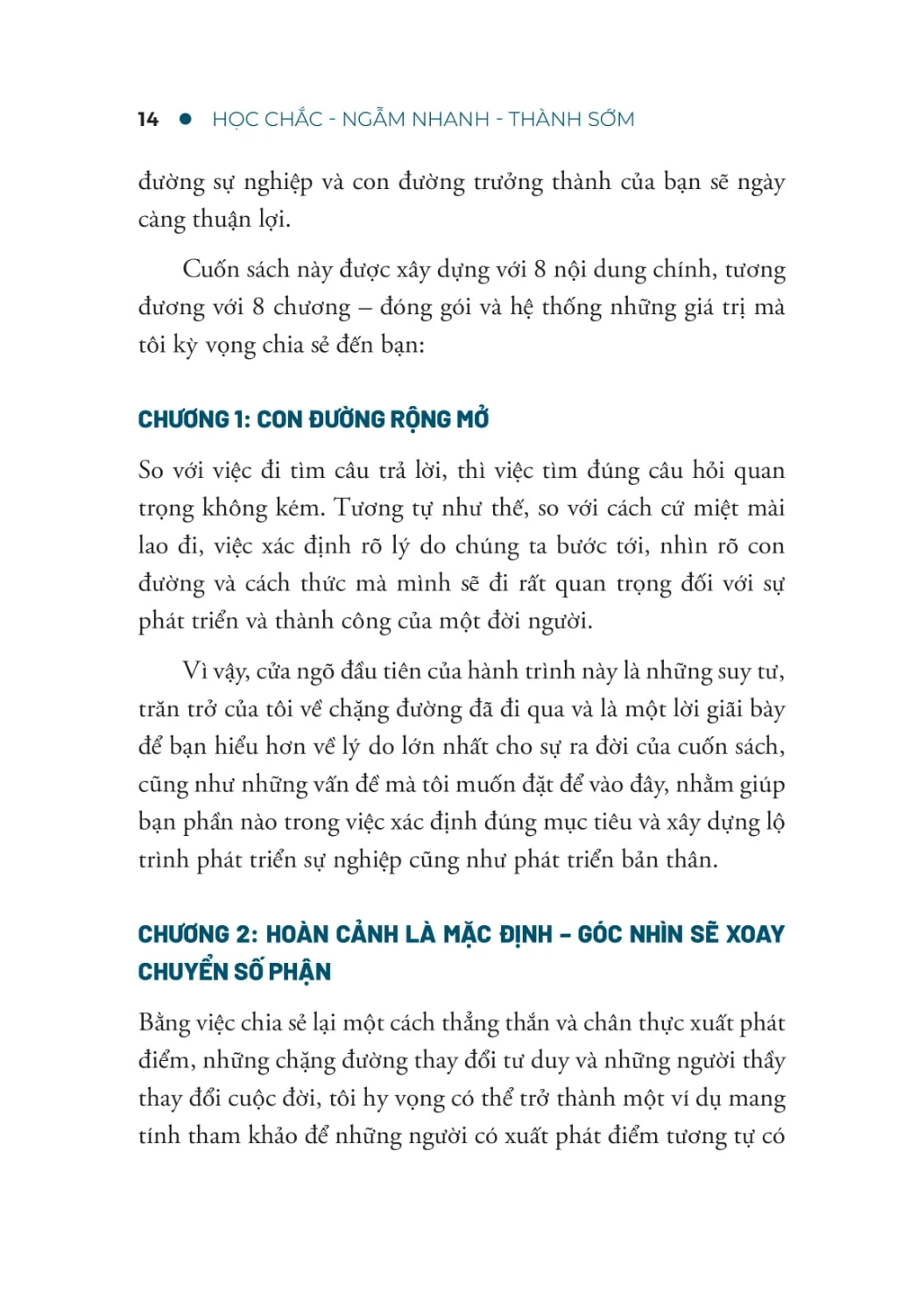 Mua tại TiktokHọc Chắc - Ngẫm Nhanh - Thành Sớm Phát triển sự nghiệp - ngẫu nhiên thành công hay chủ động nắm bắt A. TÓM TẮT SÁCH Cuốn sách "Học Chắc - Ngẫm Nhanh - Thành Sớm" là sự chia sẻ về hành trình phát triển sự nghiệp và bản thân của tác giả Nguyễn Minh Tuấn. Với cấu trúc 8 chương, tác giả truyền tải các bài học quý giá về việc học hỏi, suy ngẫm, và đạt được thành công sớm. Qua những trải nghiệm cá nhân, tác giả nhấn mạnh tầm quan trọng của việc học chắc – xây dựng nền tảng vững chắc, ngẫm nhanh – rút ra bài học từ thực tiễn, và từ đó đạt được thành công một cách chủ động. Nội dung không chỉ giới hạn ở lý thuyết mà còn đậm tính thực hành, giúp người đọc ứng dụng ngay vào công việc và cuộc sống, hướng tới phát triển bản thân và xây dựng sự nghiệp bền vững. B. GIÁ TRỊ CỦA CUỐN SÁCH Cung cấp phương pháp phát triển sự nghiệp sớm: Giúp người đọc có tư duy phát triển sự nghiệp hiệu quả từ sớm, tránh những sai lầm phổ biến khi bắt đầu đi làm. Thực tiễn và có tính ứng dụng cao: Các bài học từ sách có thể được áp dụng trực tiếp vào cuộc sống và công việc, không chỉ đơn thuần là lý thuyết. Xây dựng tự tin và tư duy phản biện: Tác giả nhấn mạnh sự quan trọng của việc xây dựng tự tin, tư duy phản biện để đạt được thành công. Khuyến khích phát triển mối quan hệ và thuyết phục: Giúp độc giả hiểu tầm quan trọng của việc xây dựng mạng lưới quan hệ và kỹ năng thuyết phục trong công việc. Hỗ trợ định hướng sự nghiệp cá nhân: Sách không chỉ giúp độc giả phát triển về chuyên môn mà còn hướng dẫn cách xây dựng sự nghiệp phù hợp với giá trị và mong muốn cá nhân. C. AI NÊN ĐỌC CUỐN SÁCH NÀY Người trẻ tuổi: Những người đang trong giai đoạn đầu phát triển sự nghiệp, muốn tìm kiếm phương pháp để học hỏi và phát triển bản thân. Người mới đi làm: Những ai đang gặp phải khó khăn và thử thách trong công việc, cần tìm kiếm động lực và phương pháp để nâng cao kỹ năng. Những người có khát vọng thành công: Các cá nhân đang mong muốn đạt được sự thành công sớm và hiệu quả trong sự nghiệp. Những nhà lãnh đạo trẻ: Những người muốn xây dựng phong cách lãnh đạo riêng và phát triển "chữ ký" cá nhân trong công việc. Người tự tìm cách phát triển bản thân: Những ai đang tìm kiếm phương pháp rèn luyện tư duy và tự cải thiện bản thân mỗi ngày, đặc biệt là trong môi trường công việc chuyên nghiệp. Sách dành cho người từ 18 đến 40 tuổi. C. CÁC TRÍCH ĐOẠN HAY “Tất cả những gì chúng ta làm hôm nay sẽ là bàn đạp, nền tảng cho ngày mai. Vậy tại sao chúng ta không kiến tạo một nền tảng tốt?” “Sự vận hành của cuộc sống là như thế, có khi thuận lợi cũng có lúc khó khăn. Trước những điều bất như ý, chúng ta thường có xu hướng lựa chọn những gì có tác dụng xoa dịu tức thì mà ít khi dành thì giờ để suy ngẫm về giá trị có được đằng sau những “cơn đau”. “Chẳng lẽ nếu gia nhập vào một công ty không nhiều điều kiện, thì bản thân sẽ dậm chân tại chỗ, không phát triển bản thân sao? Đó có vẻ không phải là tư duy hợp lý. Chúng ta hoàn toàn có quyền tự lựa chọn công cụ phù hợp với bản thân, hoặc cho dù không có công cụ đi chăng nữa, chúng ta vẫn luôn có thể tự chiêm nghiệm, tự tìm hiểu, khám phá và trải nghiệm, miễn là chúng ta chưa bao giờ tự đóng lại cánh cửa của chính mình.” GIỚI THIỆU TÁC GIẢ NGUYỄN MINH TUẤN Nguyễn Minh Tuấn là một chuyên gia Nhân sự với 15 năm kinh nghiệm dẫn dắt và phát triển tổ chức tại Đông Nam Á. Anh từng làm việc tại các công ty, tập đoàn danh tiếng trong nhiều lĩnh vực như Intel, Microsoft Việt Nam và Microsoft Nhật Bản, Avery Dennison, National Australia Bank. Với niềm đam mê phát triển con người và sự nghiệp, anh đầu tư nhiều thời gian và tâm sức cho việc học tập, nghiên cứu lĩnh vực này. Hiện tại, anh đã được chứng nhận và đang tích lũy nhiều kinh nghiệm trong vai trò Chuyên gia Khai vấn CliftonStrengths, CareerLeader và Hogan Assessments. Đây là những công cụ nổi bật và hiệu quả trong việc khám phá bản thân, phát triển nghề nghiệp đã được công nhận và ứng dụng rộng rãi trên thế giới.