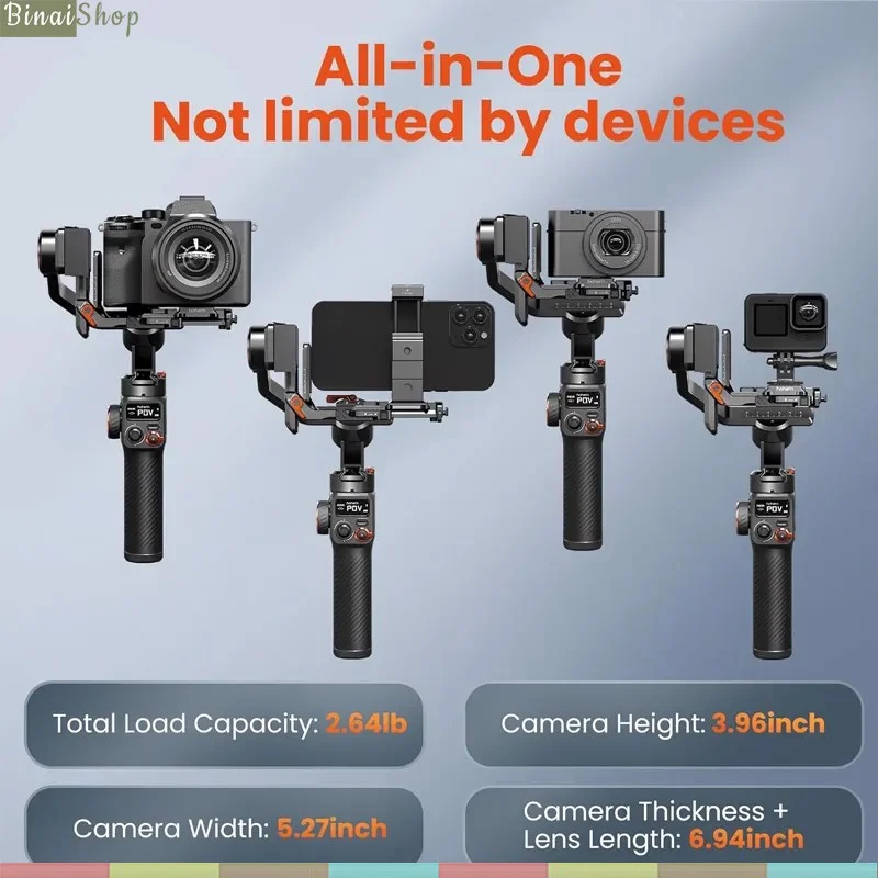 - Khả năng tương thích 4 trong 1: smartphone, action camera, máy ảnh cỡ nhỏ và máy ảnh DSLR. Tải trọng lên đến 1,2kg.