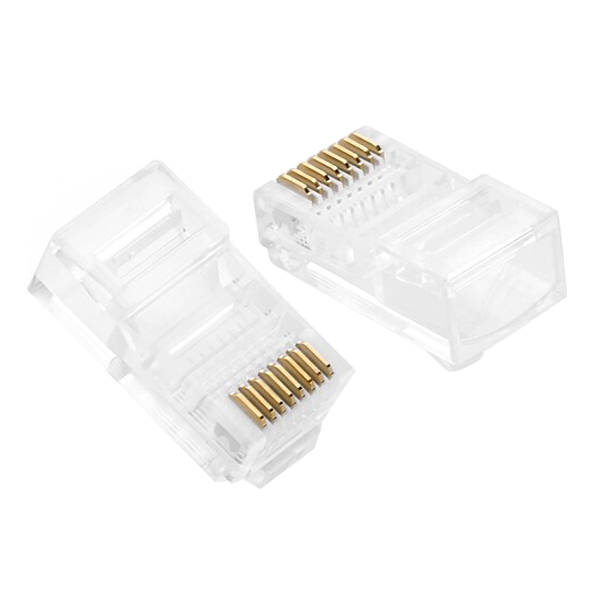 • RJ45 plug for unshielded solid wire 26-24AWG (3 prong). • 50 u” gold plated over nickel on contact. • 100 cái/bịch. Sử dụng cho phòng net bootrom không hdd Chất lượng rất tốt.