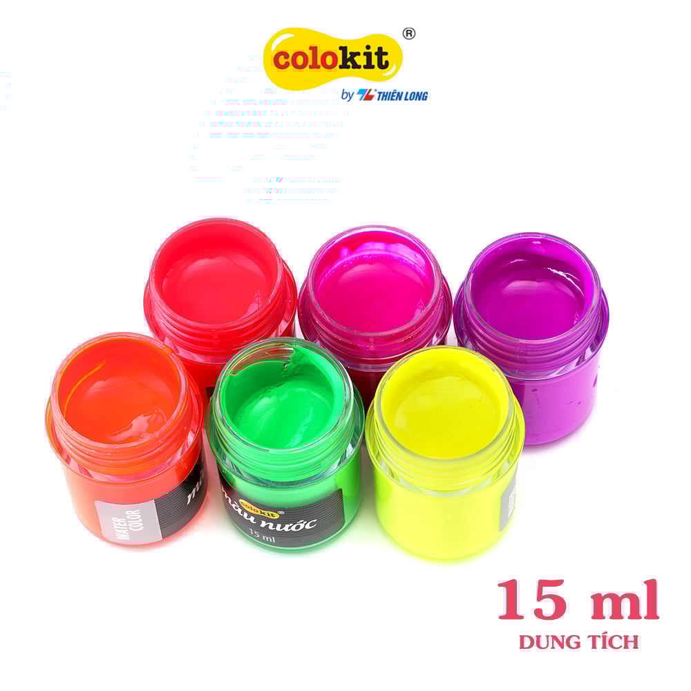 Màu nước Thiên Long Colokit WACO-C011 dạng màu nước được đựng trong mỗi lọ nhựa dung tích 15ml trong suốt nhận diện được màu bên trong.