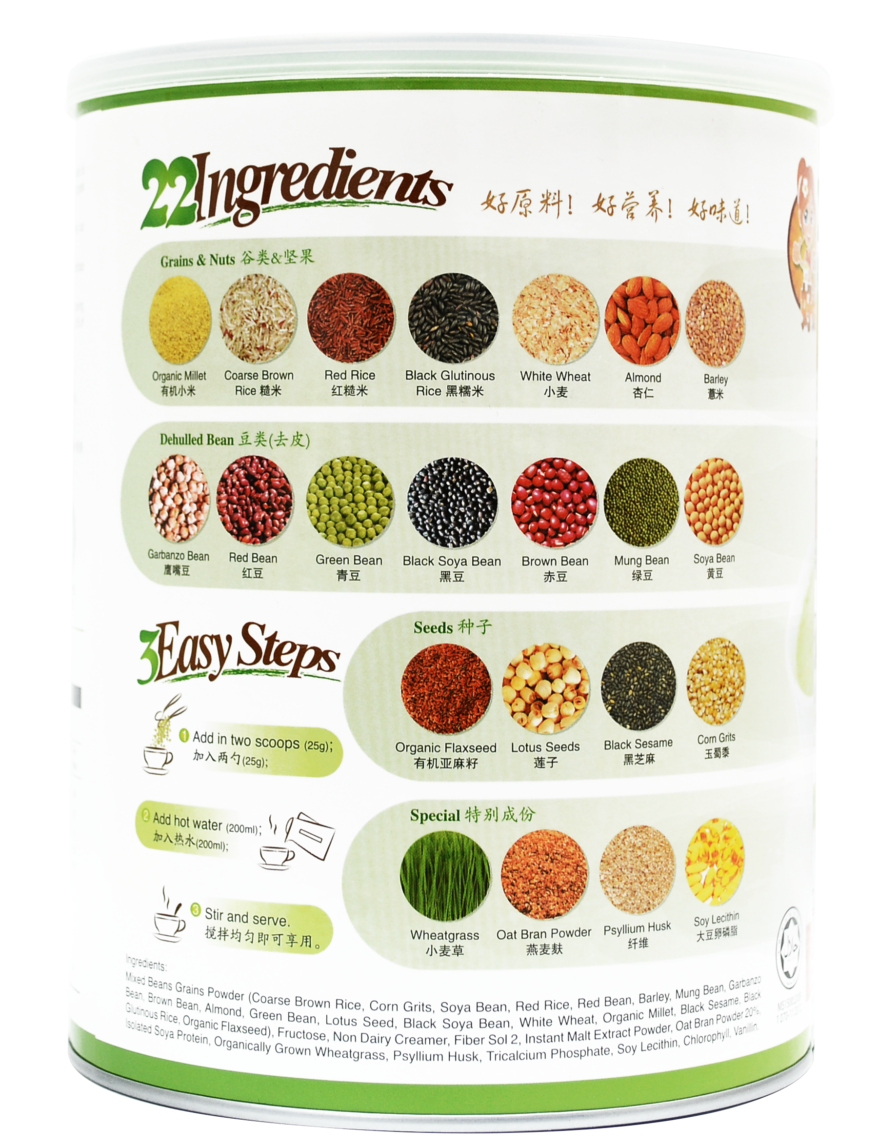 GỒM 22 DƯỠNG CHẤT: Gạo lứt, bắp, đậu nành, gạo đỏ, đậu đỏ, đại mạch, đậu xanh (đậu mung), đậu garbanzo, đậu nâu, hạnh nhân, đậu co ve, hạt sen, đậu đen, lúa mì trắng, hạt kê hữu cơ, mè đen, gạo nếp, hạt lanh hữu cơ, bột yến mạch, mầm lúa mì, vỏ hạt mã đề, lecithin đậu nành.