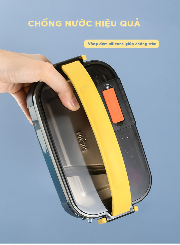 Hộp Cơm có 2 tầng chia làm 3 ngăn với tổng dung tích 1.6L đựng được nhiều hơn Hộp 2 lớp: 1 khay nhựa và 1 khay INOX, giúp cách nhiệt tốt hơn. Gioăng Silicone