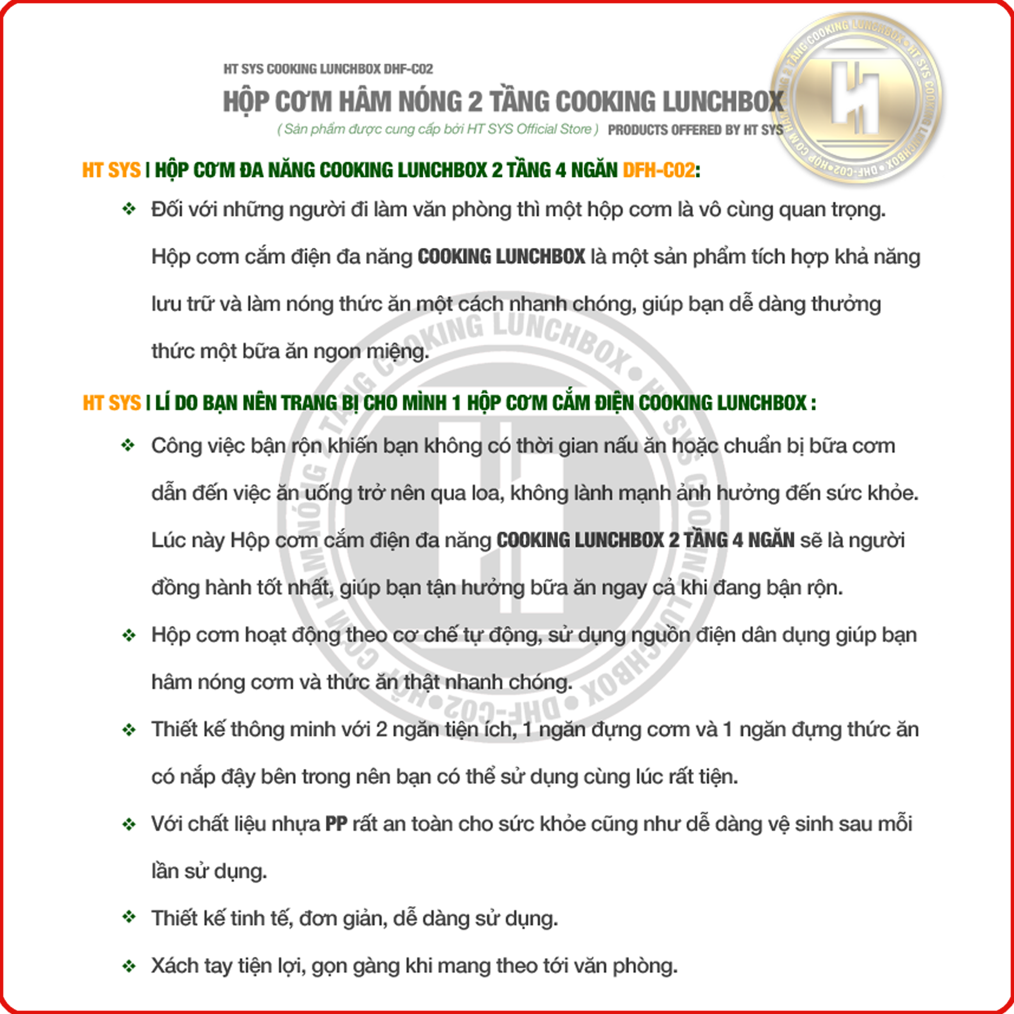 - Công dụng: hâm nóng và nấu chín thức ăn. ƯU ĐIỂM HỘP CƠM HT SYS: Bạn có thể hâm nóng thức ăn hoặc chuẩn bị thực phẩm rồi nấu bằng hộp cơm này. Với nguyên lí dùng hơi nước làm chín, hâm nóng đồ ăn nên bạn yên tâm về độ an toàn. Sản phẩm được làm từ nhựa PP an toàn tuyệt đối cho người sử dụng. Bao gồm 2 tầng và 4 hộp cơm inox nên bạn sẽ yên tâm về bữa ăn đầy đủ dinh dưỡng. Bạn sẽ tiết kiệm thời gian, không cần chuẩn bị nhiều thứ rờm rà. Thích hợp với tất cả mọi lứa tuổi, đặc biệt là học sinh, sinh viên và dân văn phòng… CÁC BƯỚC SỬ DỤNG HỘP CƠM CẮM ĐIỆN HT SYS: Bước 1: Cho lượng nước 250ml cần thiết vào thân hộp. Khi cắm điện, đế nhiệt sẽ đun sôi lượng nước này. Bước 2: Cho đồ ăn cần hâm nóng hoặc đồ ăn sống vào các hộp đựng sau đó đóng chặt nắp gài.(Lưu ý khi đun cần bỏ nắp đậy của các bát inox ra ngoài để tránh nhiệt lượng quá cao làm vênh nắp).