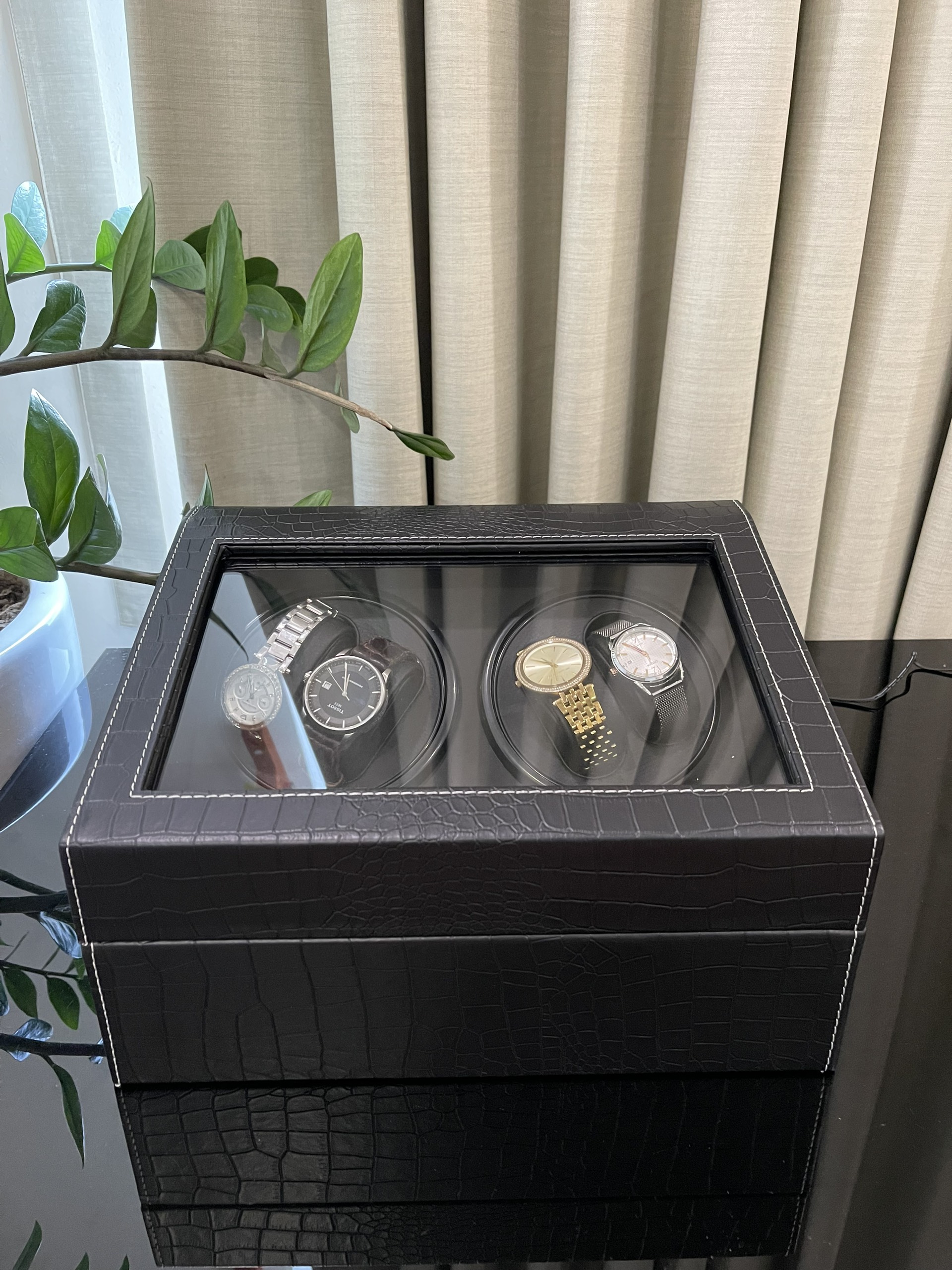 Hộp Đựng Đồng Hồ Cơ 4 Xoay 6 Trưng Bày Da Đen Lót Kem