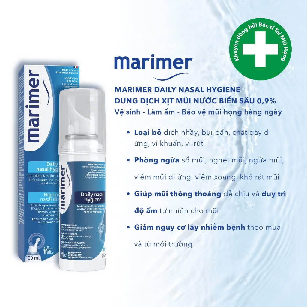 Dung dịch xịt mũi Marimer là dung dịch nước biển tự nhiên 100%, giàu muối khoáng và các nguyên tố vi lượng. Có thể sử dụng hàng ngày nhờ nồng độ sinh lý (đẳng