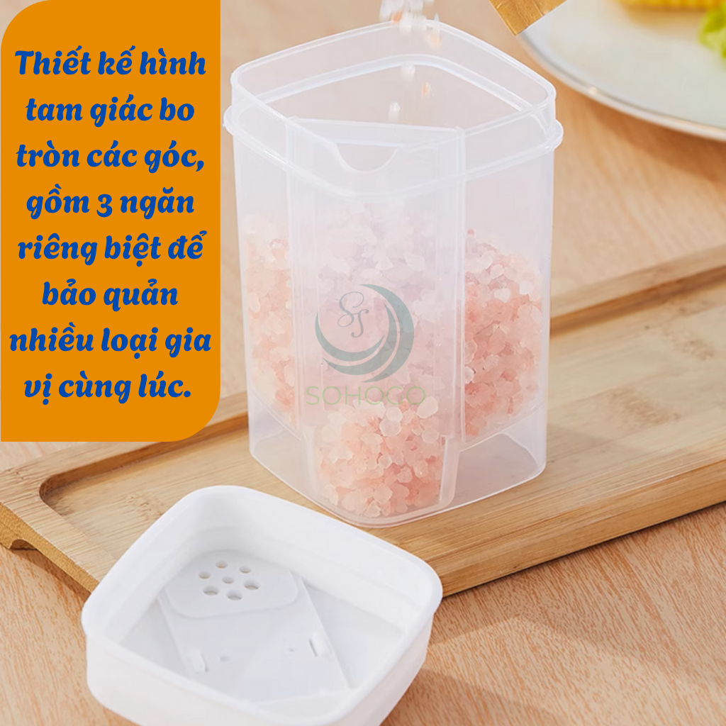 • 3 ngăn tiện dụng – đựng được nhiều loại gia vị khác nhau (muối, tiêu, bột nêm, mè, đường,...)