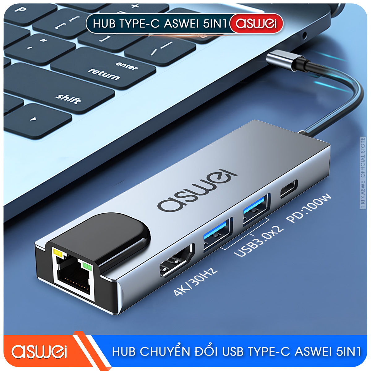 ✨Hub Chuyển Đổi USB Type C ASWEI 5 in 1 - HDMI, USB 3.0, Lan, PD 100W Tốc Độ Cao - Hàng Chính Hãng