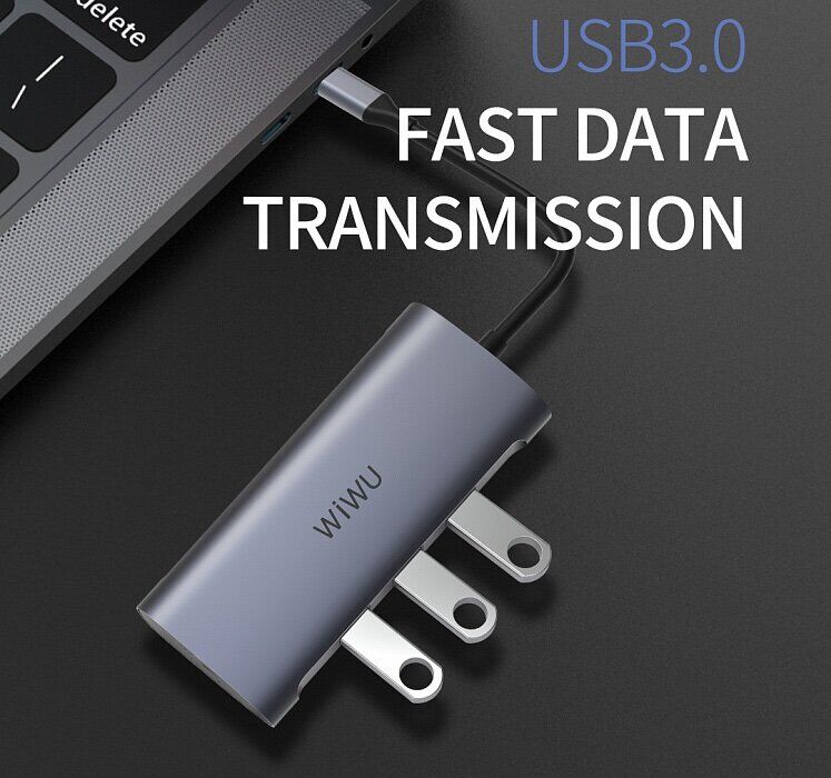 Hub sạc nhanh đa năng 7 in 1 chia cổng Type-C hiệu WIWU ALPHA A731HP thành cổng Type-C PD 3.0, 3 cổng USB 3.0, SD & Micro SD, cổng HDMI chuẩn 4k cho Macbook Pro / Smartphone đạt chứng nhận MFI.