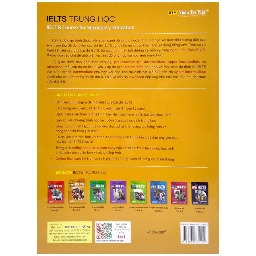 Đây là bộ giáo trình được biên soạn dành riêng cho học sinh trung học với mục tiêu hướng dẫn các em luyện tập để đạt điểm cao khi thi IELTS cũng như nâng cao khả năng sử dụng tiếng Anh. Trên cơ sở bám sát yêu cầu của bài thi IELTS, bộ giáo trình này bồi dưỡng cả bốn kỹ năng nghe, nói, đọc và viết thông qua các chủ đề phổ biến và trình độ phù hợp với học sinh trung học.