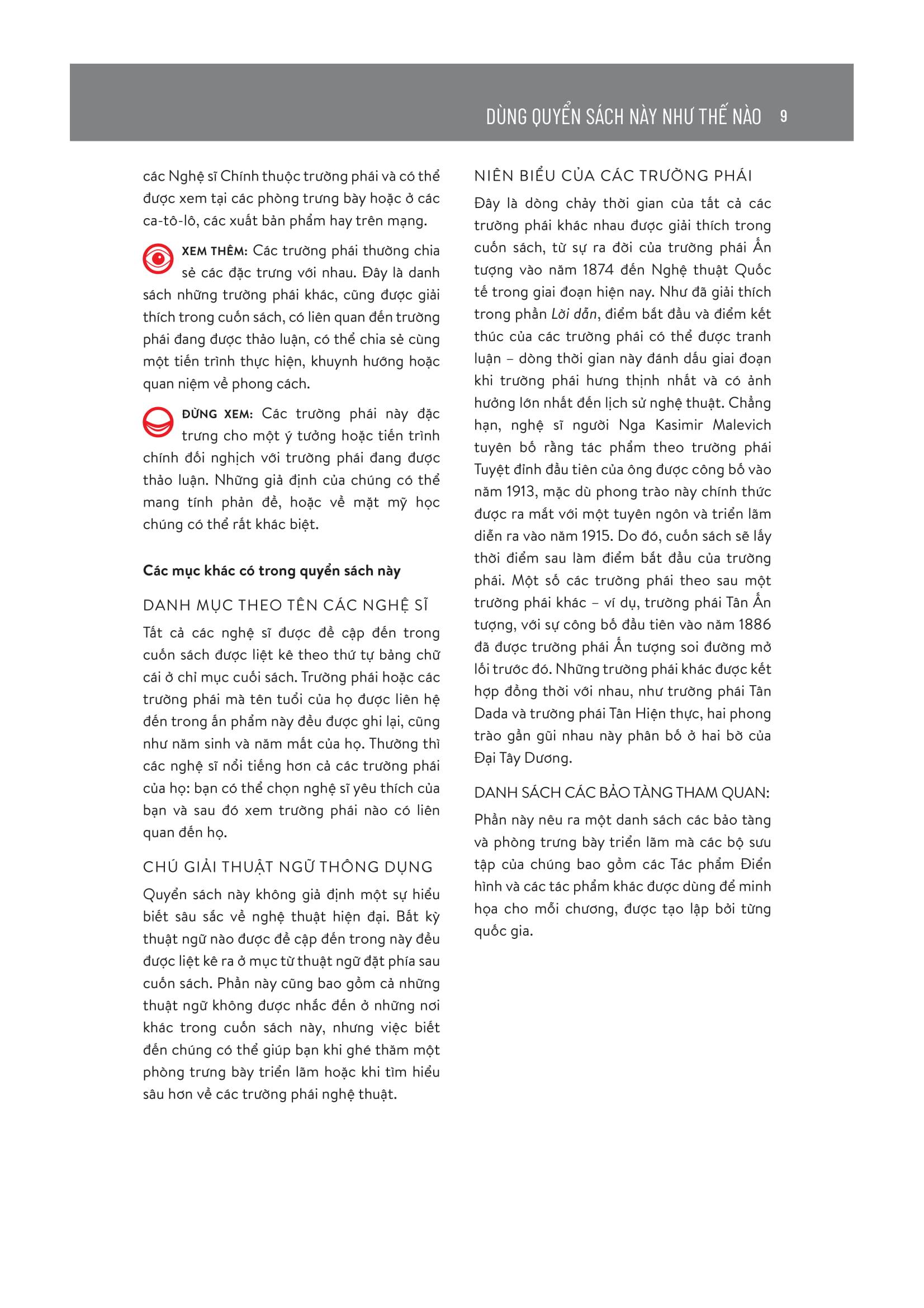 Cuốn sách này là một cẩm nang ngắn gọn giới thiệu cho bạn đọc về 55 trào lưu, trường phái và phong cách thịnh hành từ thời kỳ bình minh hé sáng của nghệ thuật hiện đại cuối thế kỷ 19 cho đến nay, nhằm giúp các bạn làm quen và tiếp cận được một nhánh của dòng chảy lịch sử nghệ thuật.